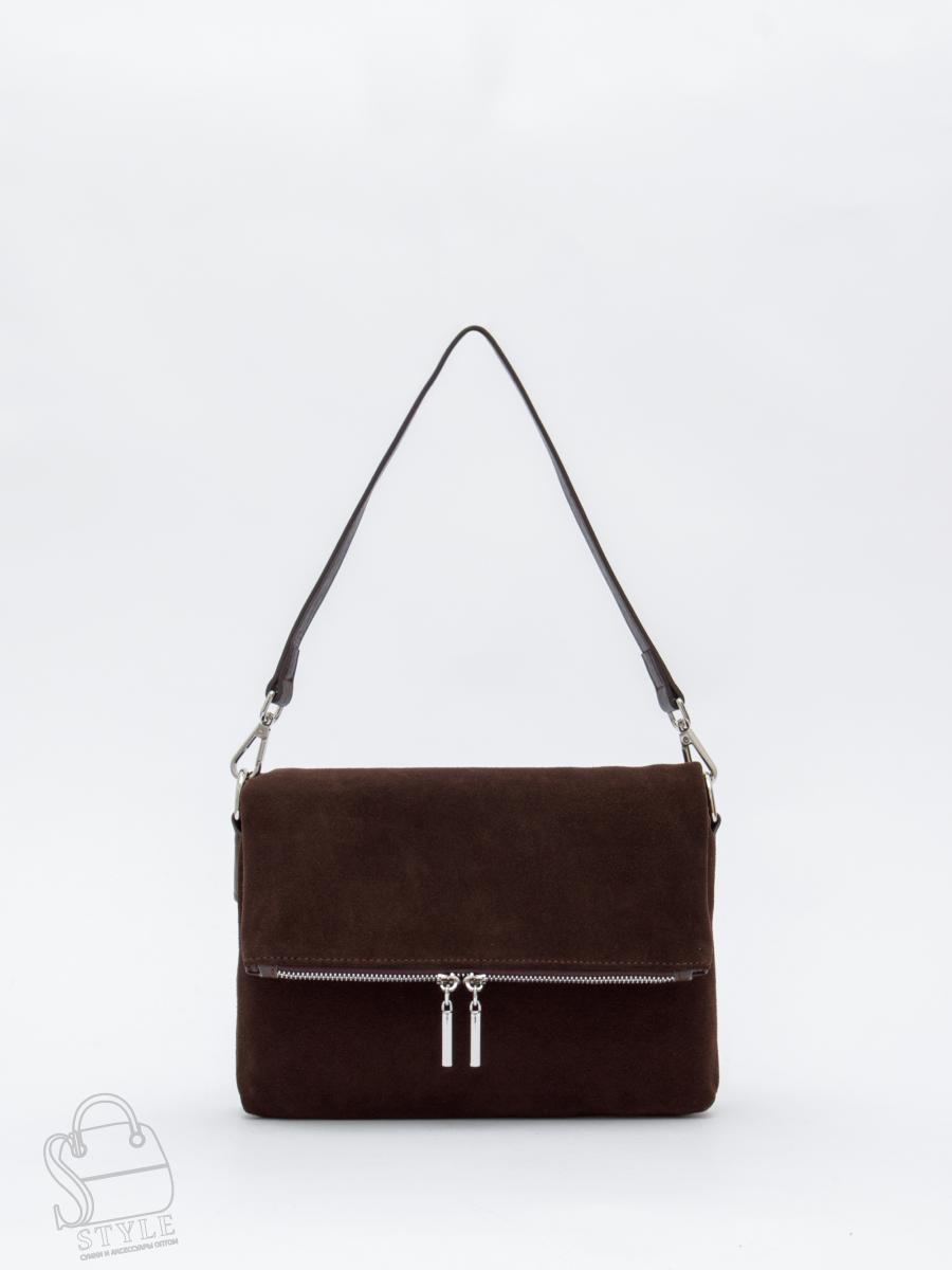 Модель кросс-боди, выполнена из замши. Дополнена серебристой фурнитурой. Данная модель закрывается на клапан. Каркас полужесткий. Носится в руке за съемную удлиненную ручку или на плече. В комплекте имеется съемный ремень с регулировкой длины.