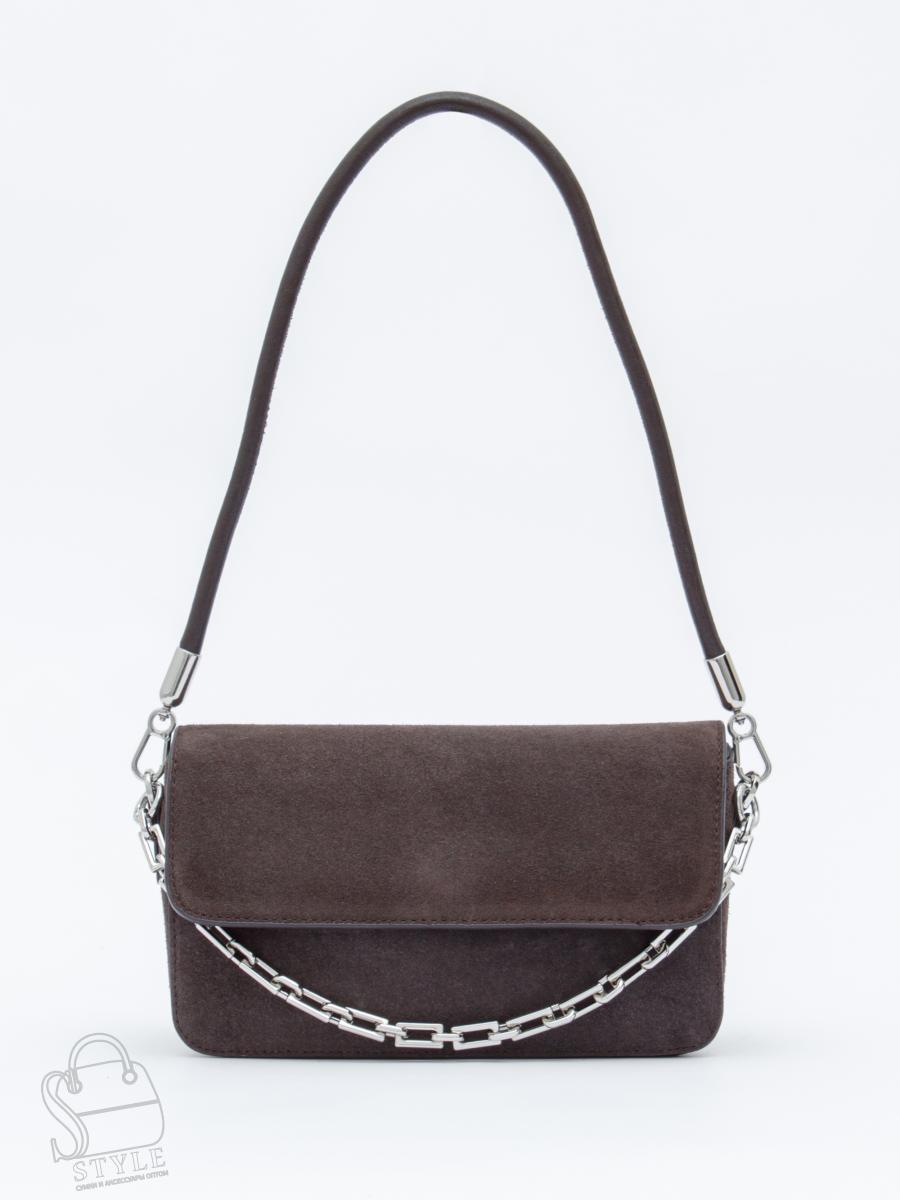 Сумка-багет, выполнена из замши. Декорирована цепочкой. Дополнена серебристой фурнитурой. Данная модель закрывается на клапан. Каркас полужесткий. Носится на плече за съемную ручку или через плечо. В комплекте имеется съемный ремень с регулировкой длины.