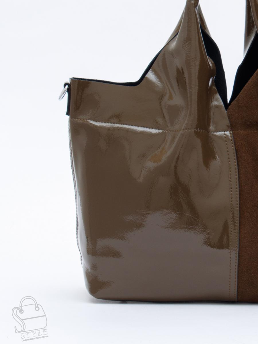 Вместительная модель, выполнена из замши и лаковой кожи. Декорирована бантом на передней части. Дополнена серебристой фурнитурой.  Данная модель закрывается на молнию. Носится  в руке за встроенные ручки или на плече за съемный  ремень с регулировкой длины. Каркас полужесткий. На дне предусмотрены ножки.