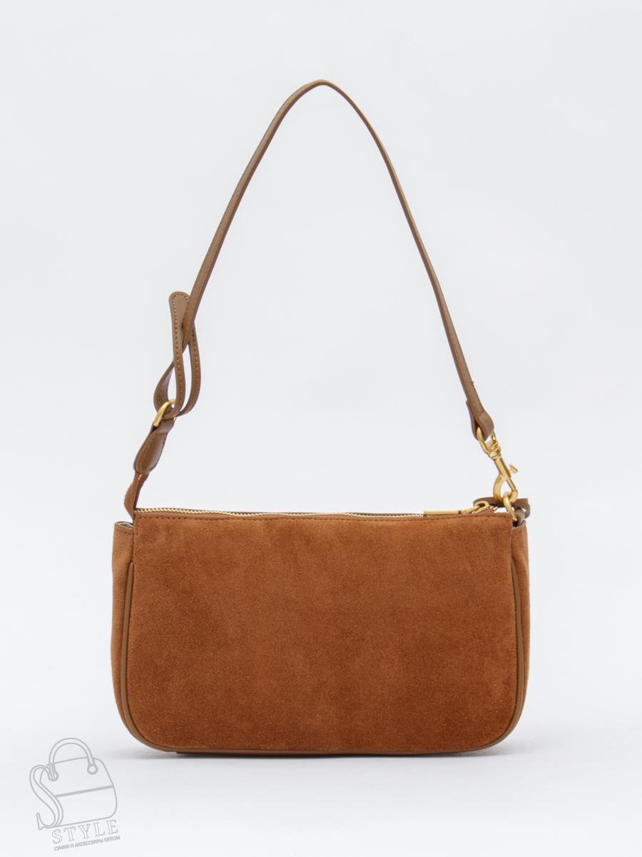 Небольшая базовая модель, выполнена из натуральной замши.  Дополнена золотистой фурнитурой. Данная модель закрывается на молнию. Каркас полужесткий. Носится в руке за съемную ручку или на плече. Плечевой ремень регулируется по длине.