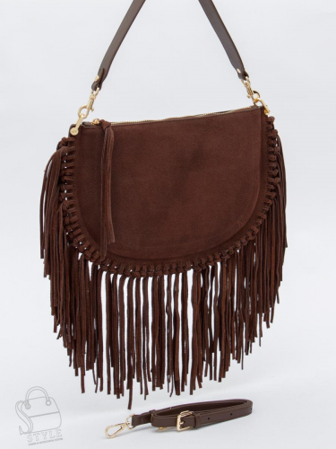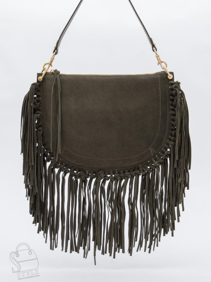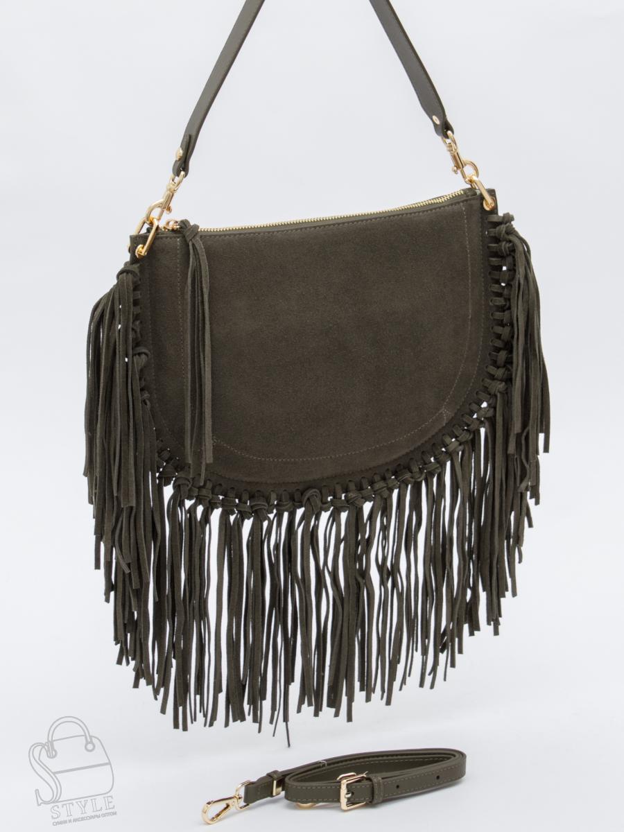 Эффектная модель, выполнена из замши. Декорирована бахромой. Дополнена золотистой фурнитурой. Данная модель закрывается на молнию Каркас мягкий. Носится в руке за съемную удлиненную ручку или на плече. В комплекте имеется съемный ремень с регулировкой длины.