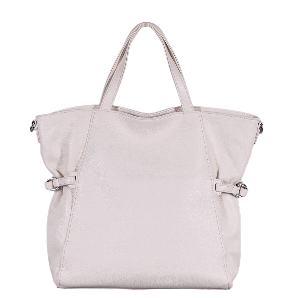 Удобная сумка, выполнена из натуральной кожи. Декорирована застежками по бокам. Дополнена серебристой фурнитурой. Данная модель закрывается на молнию. Каркас мягкий. Носится через плечо или в руке за ручки. В комплекте тонкий ремень с регулировкой длины.