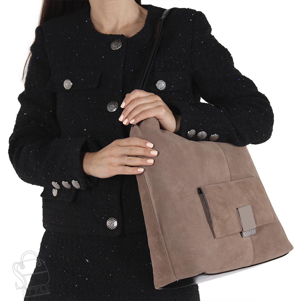 Вместительная модель, выполнена из натуральной кожи и замши. Декорирована пряжкой на передней части.  Дополнена серебристой фурнитурой. Данная модель закрывается на молнию. Каркас полужесткий. Носится через плечо или в руке. Встроенная ручка регулируется по длине.
