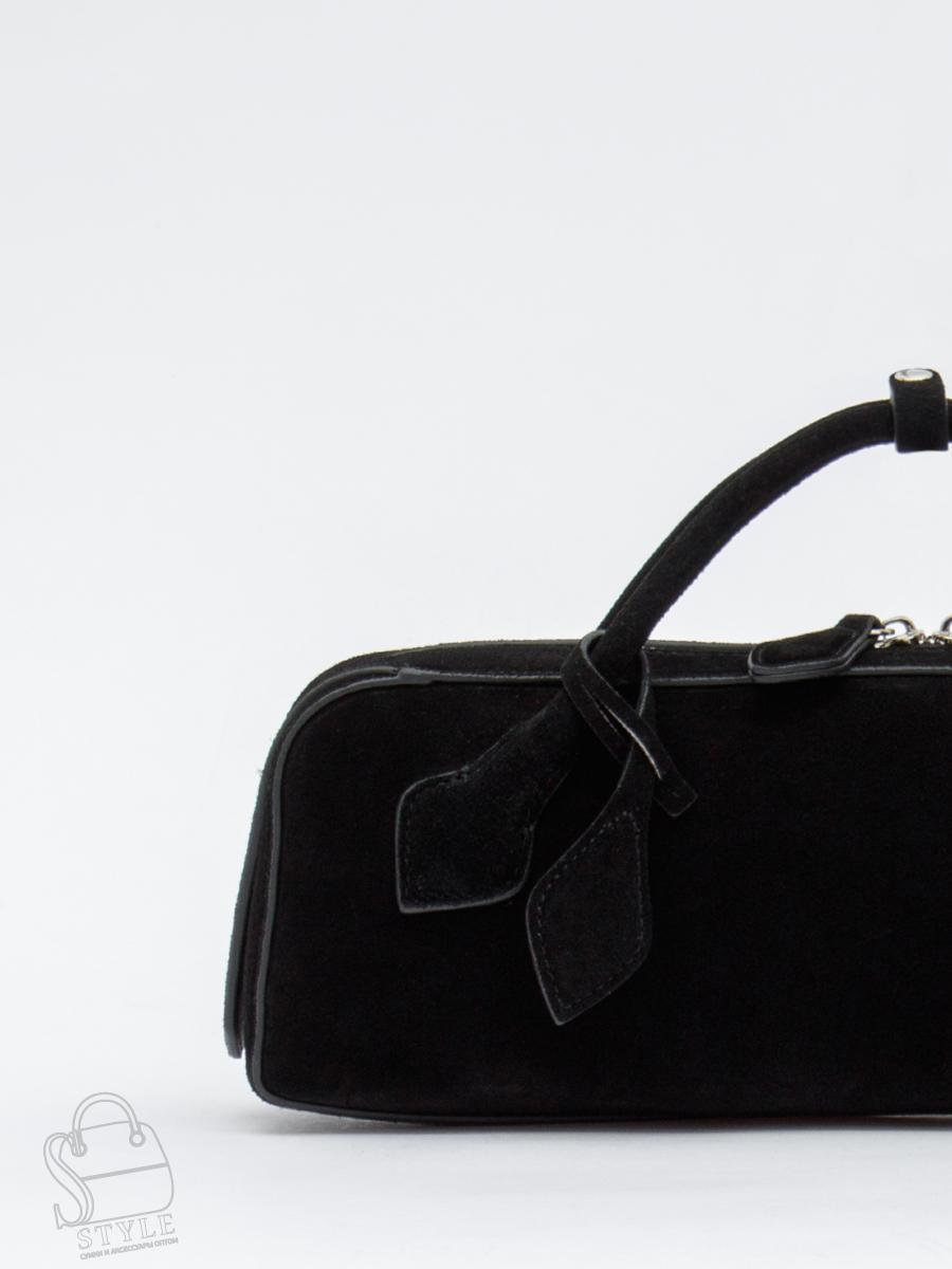 Модель-багет, выполнена из замши. Декорирована брелоком. Дополнена серебристой фурнитурой. Данная модель закрывается на молнию, носится в руке за встроенные ручки или на плече с помощью ремня. В комплекте предусмотрен ремень с регулировкой длины. Каркас полужесткий.