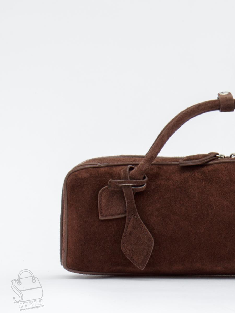 Модель-багет, выполнена из замши. Декорирована брелоком. Дополнена серебристой фурнитурой. Данная модель закрывается на молнию, носится в руке за встроенные ручки или на плече с помощью ремня. В комплекте предусмотрен ремень с регулировкой длины. Каркас полужесткий.