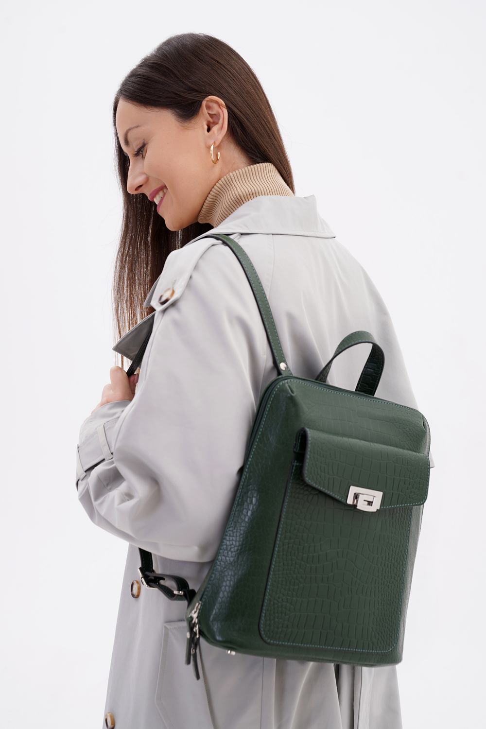 Сумка-рюкзак женская среднего размера. Сумка застегивается на молнию и имеет одно отделение. Лямки рюкзака регулируются по длине. На передней стенке расположен накладной карман с клапаном на металлическом замке. На задней стенке есть карман на молнии. Сумка-рюкзак на подкладке. Внутри сумка имеет средник на молнии из плотной материала, карман на молнии и накладной карман для мобильного телефона и визиток. 28х31х13 см