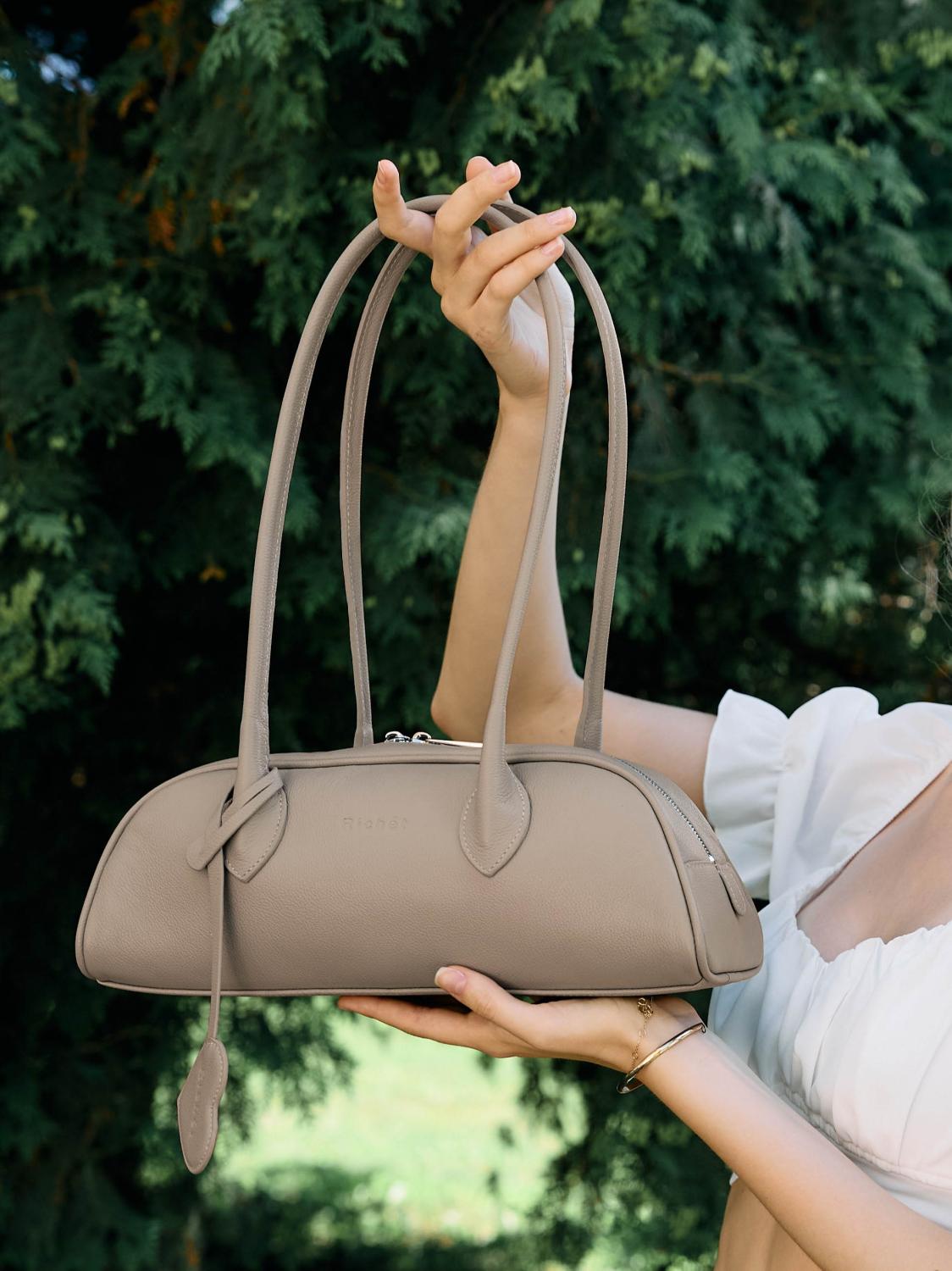 Великолепная функциональная сумка-багет из натуральной кожи от Richet (РИШЕ) закрывается на молнию в стилистике bowling bag.