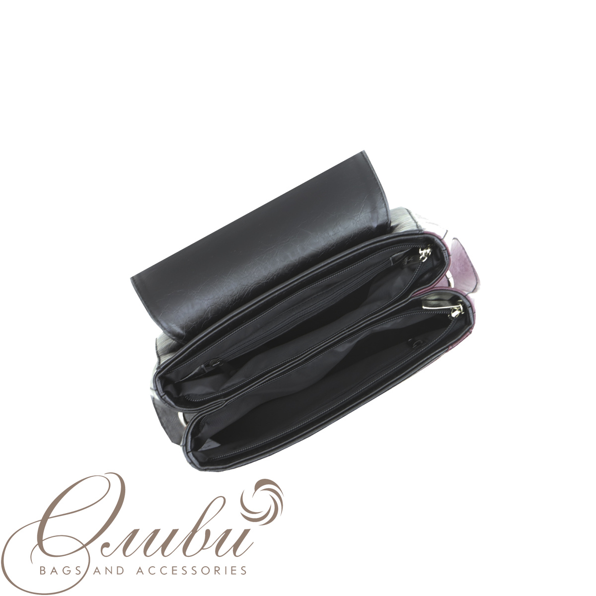 Два отделения на молнии с клапаном. Задняя стенка - карман на молнии. Внутри: карман на молнии, открытый карман, карман для документов.