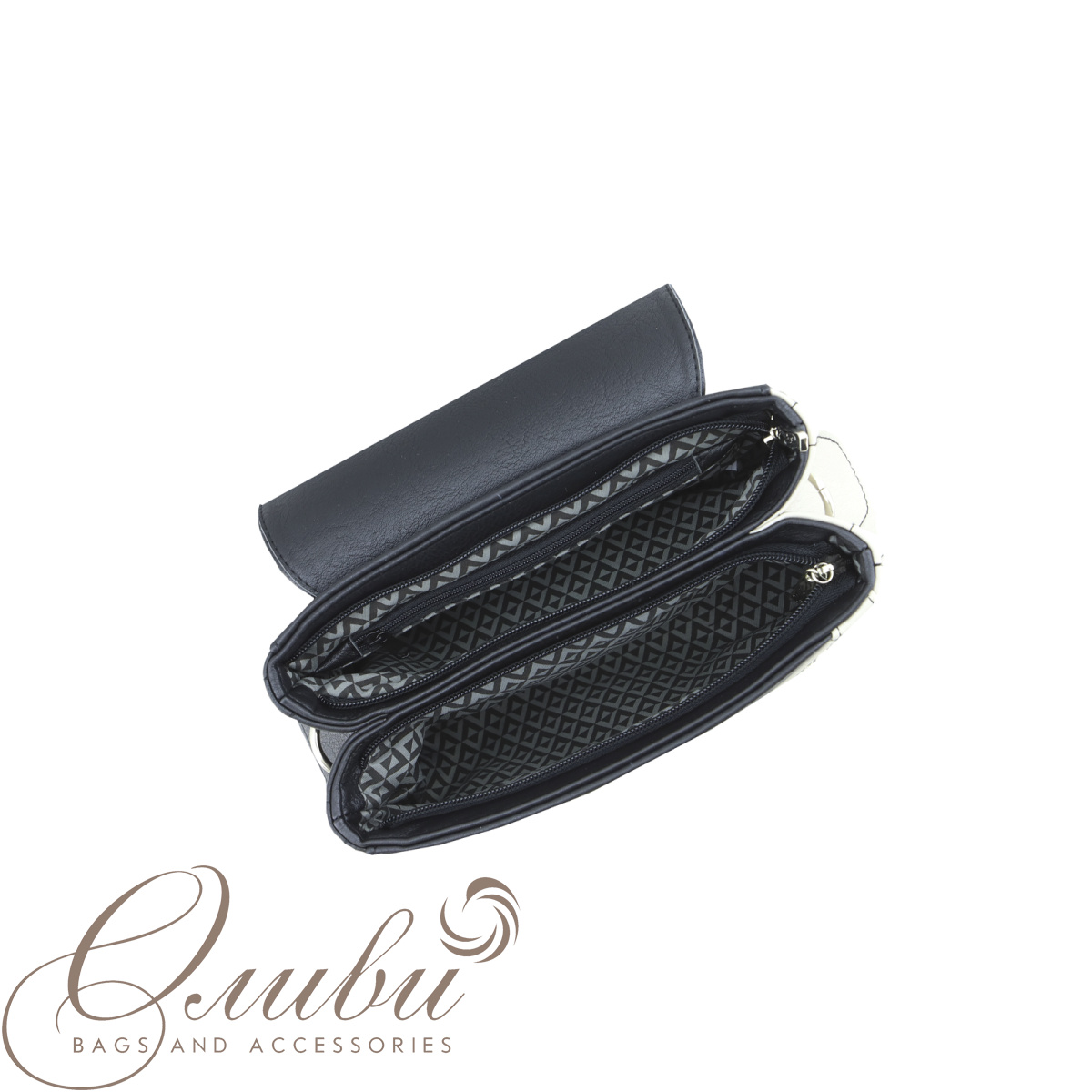 Два отделения на молнии с клапаном. Задняя стенка - карман на молнии. Внутри: карман на молнии, открытый карман, карман для документов.