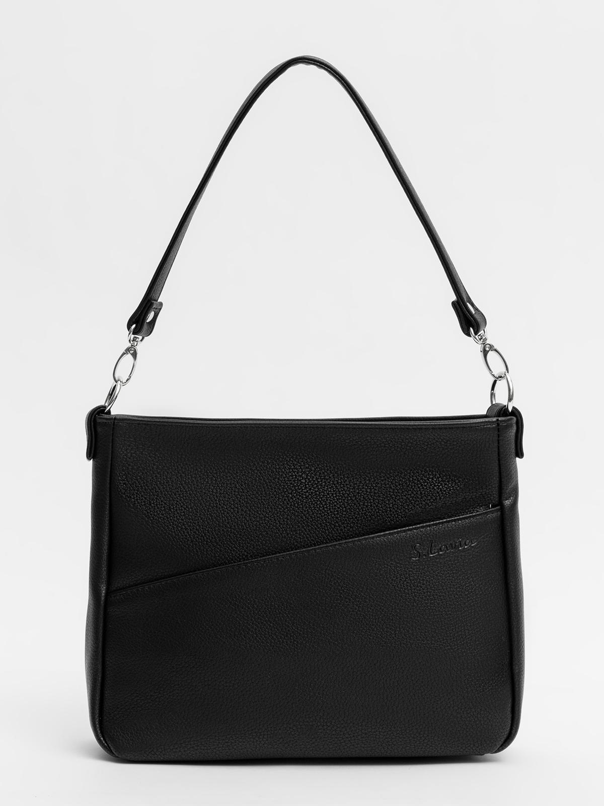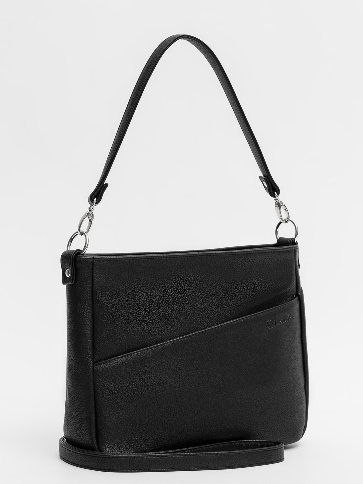 Геометричная форма с диагональным карманом и естественной складкой верха создаёт стильный женственный силуэт. В комплекте — съёмная короткая ручка и регулируемый ремень для разных вариантов ношения: в руке, на плече или через плечо.