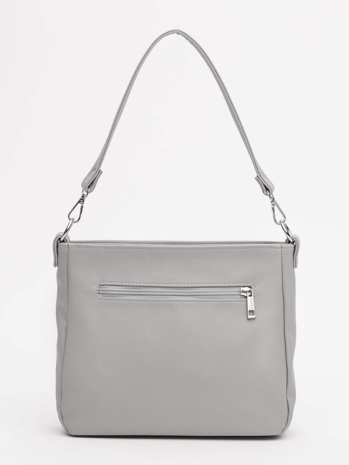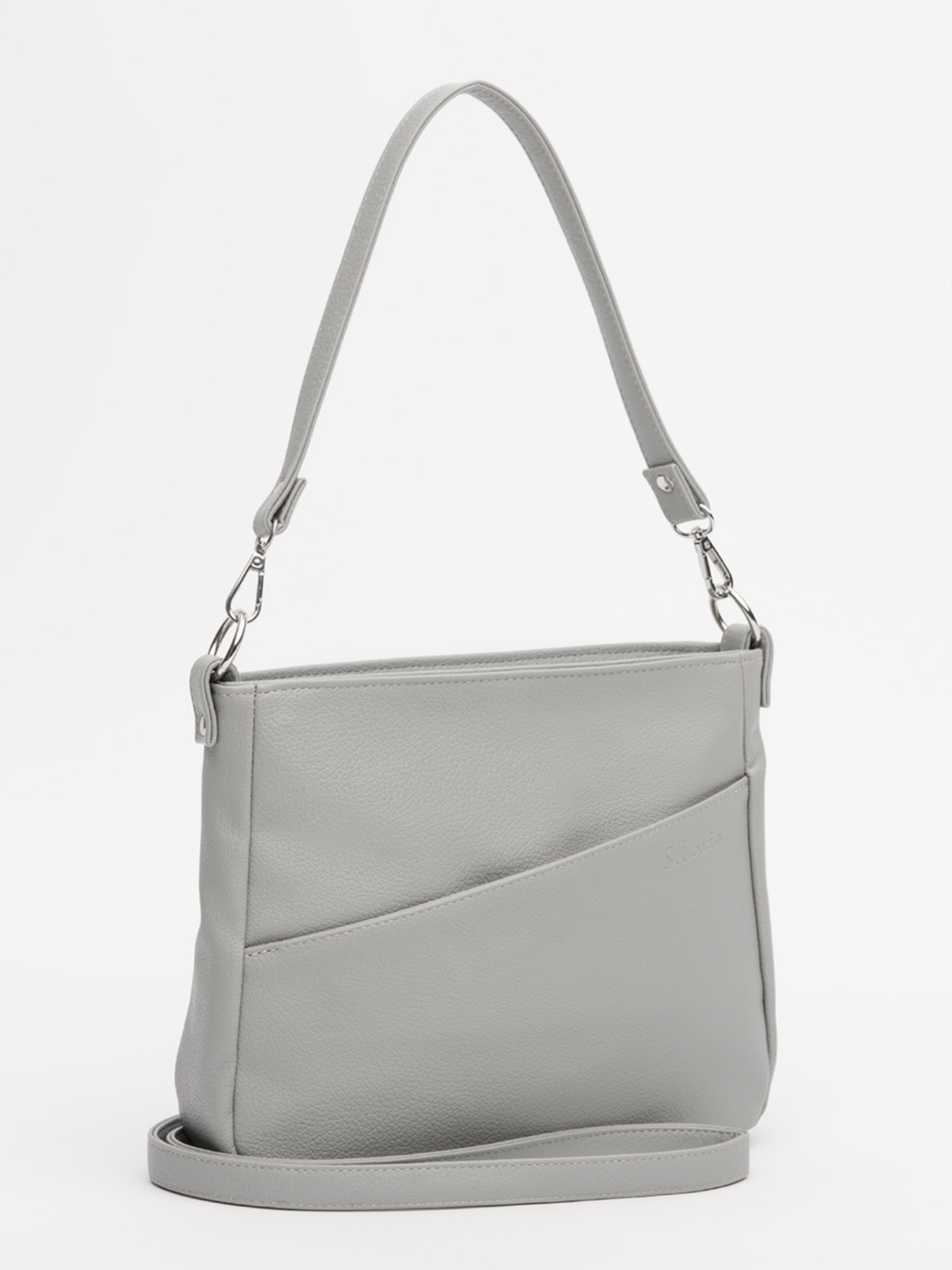 Геометричная форма с диагональным карманом и естественной складкой верха создаёт стильный женственный силуэт. В комплекте — съёмная короткая ручка и регулируемый ремень для разных вариантов ношения: в руке, на плече или через плечо.