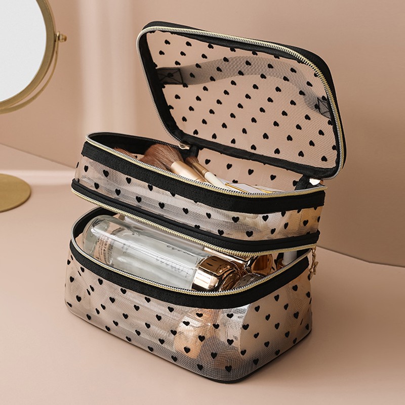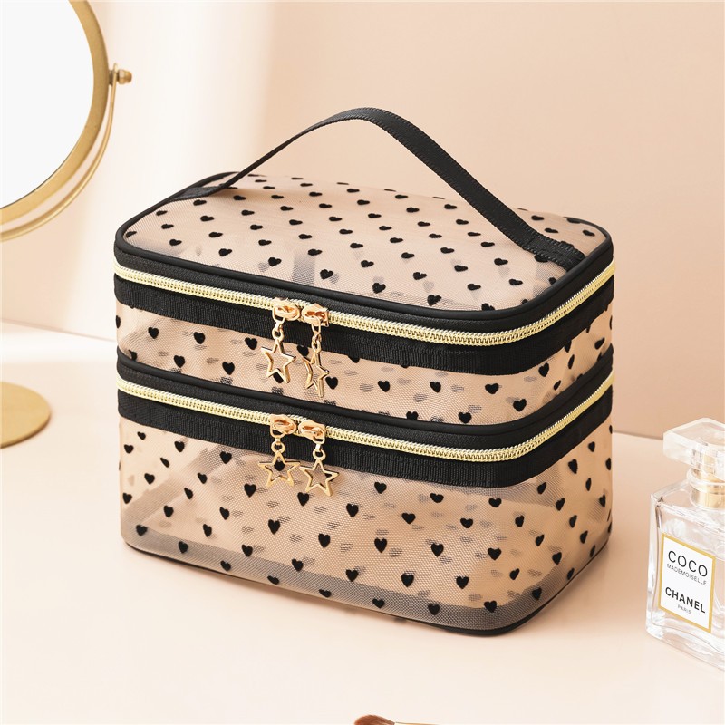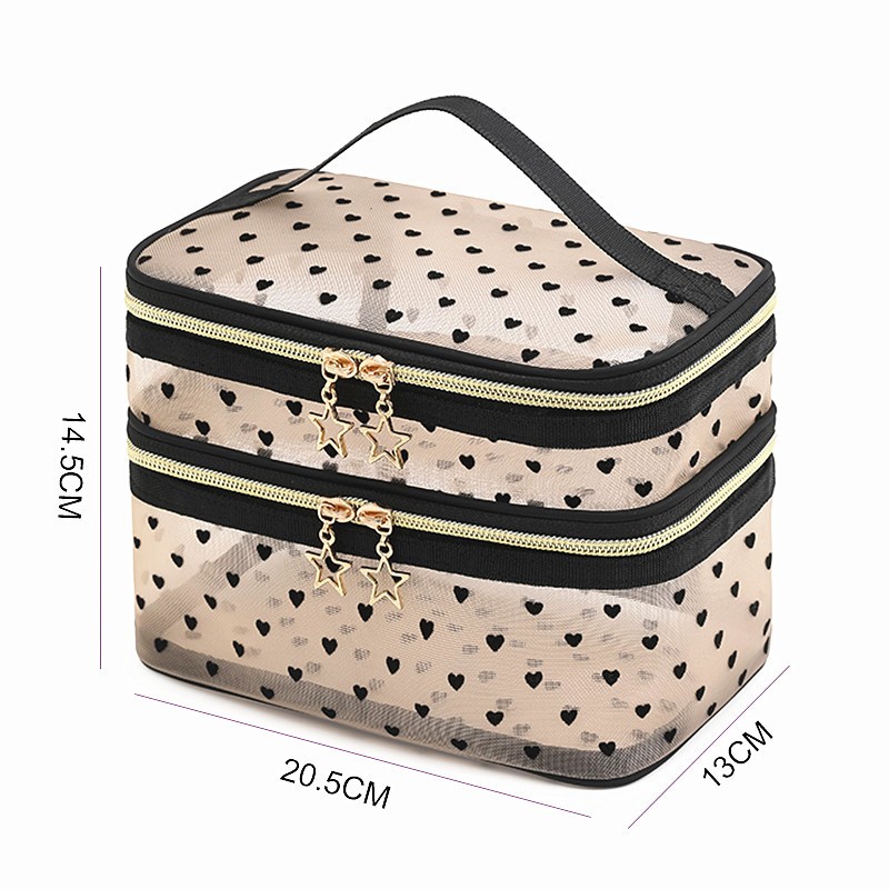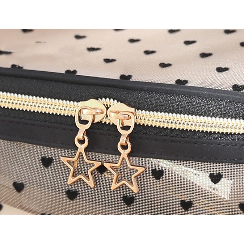 Прозрачный двухъярусный органайзер изготовлен из мягкой нейлоновой сетки в стильном бежевом цвете с черными сердечками. Бегунки на молнии декорированы золотой звездочкой.