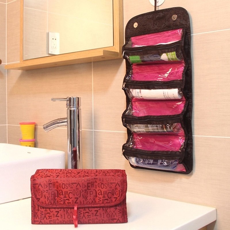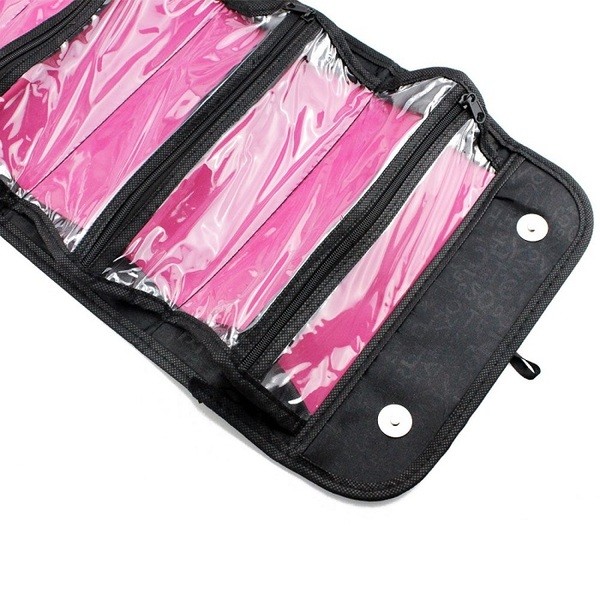 Roll-N-Go обладает большой вместительностью (примерно 20-25 предметов), но при этом имеет компактные размеры. Вы можете сложить в него всю имеющуюся косметику, после чего свернуть органайзер в небольшой рулончик и закрыть на кнопки. Если же вам необходимо часто им пользоваться, то органайзер можно развернуть и подвесить в таком виде за специальную петлю.