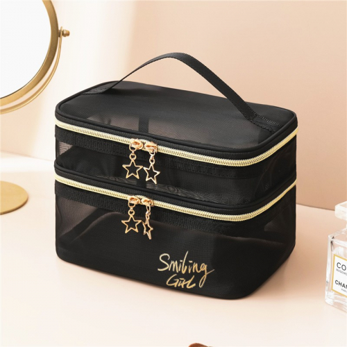 Прозрачный органайзер изготовлен из мягкой нейлоновой сетки в стильном черном цвете. Бегунок на молнии декорирован золотой звездочкой.