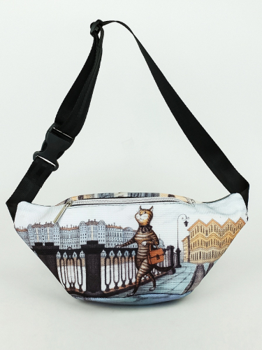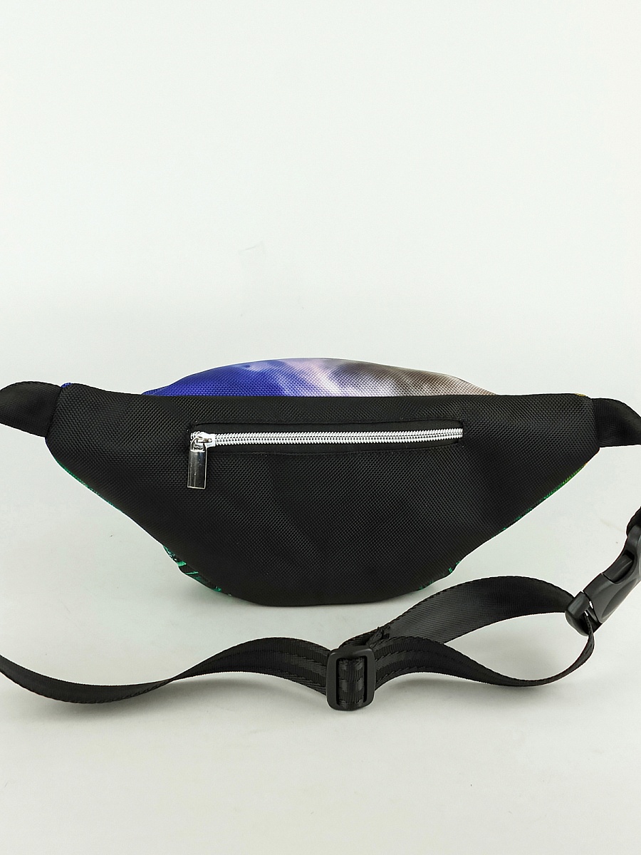 Поясная сумка . Современные разнообразные принты позволяют носить сумку как с повседневной так и со спортивной одеждой. Имеет два больших отделения под молнию. Основное отделение  не содержит дополнительных карманов и отсеков, а представляет из себя одно большое цельное пространство. Сзади карман под молнию. Минимальная длинна ремня 54 см, месте с сумкой минимальная длина окружности составляет 90 см. Максимальная длинна ремня 84 см. Вместе с сумкой максимальная длина окружности 120 см. Ремень оборудован прочным пластиковым замком типа фастекс.