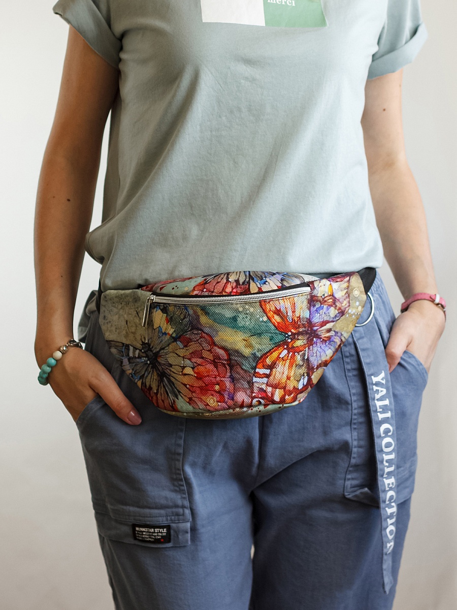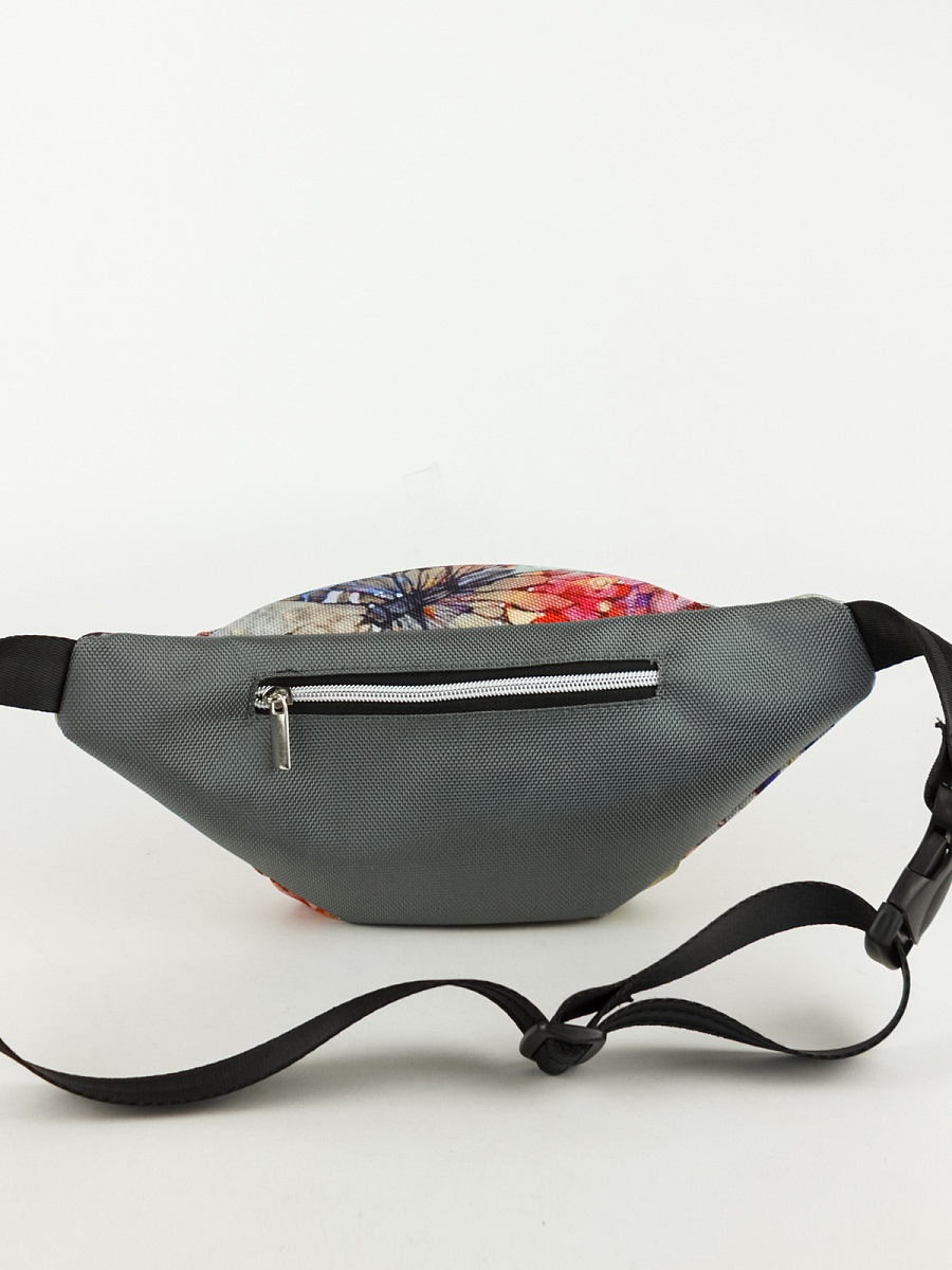 Поясная сумка . Современные разнообразные принты позволяют носить сумку как с повседневной так и со спортивной одеждой. Имеет два больших отделения под молнию. Основное отделение  не содержит дополнительных карманов и отсеков, а представляет из себя одно большое цельное пространство. Сзади карман под молнию. Минимальная длинна ремня 54 см, месте с сумкой минимальная длина окружности составляет 90 см. Максимальная длинна ремня 84 см. Вместе с сумкой максимальная длина окружности 120 см. Ремень оборудован прочным пластиковым замком типа фастекс.
