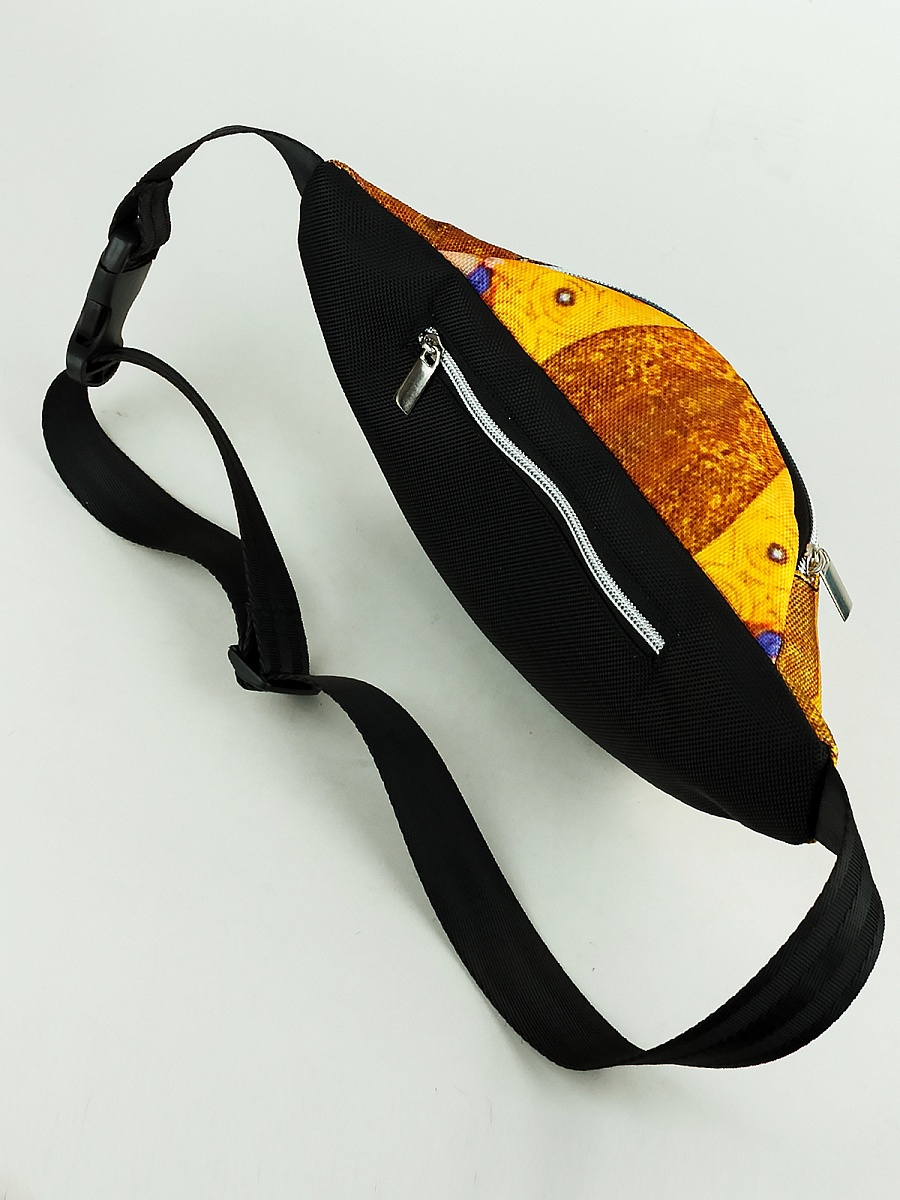 Поясная сумка . Современные разнообразные принты позволяют носить сумку как с повседневной так и со спортивной одеждой. Имеет два больших отделения под молнию. Основное отделение  не содержит дополнительных карманов и отсеков, а представляет из себя одно большое цельное пространство. Сзади карман под молнию. Минимальная длинна ремня 54 см, месте с сумкой минимальная длина окружности составляет 90 см. Максимальная длинна ремня 84 см. Вместе с сумкой максимальная длина окружности 120 см. Ремень оборудован прочным пластиковым замком типа фастекс.