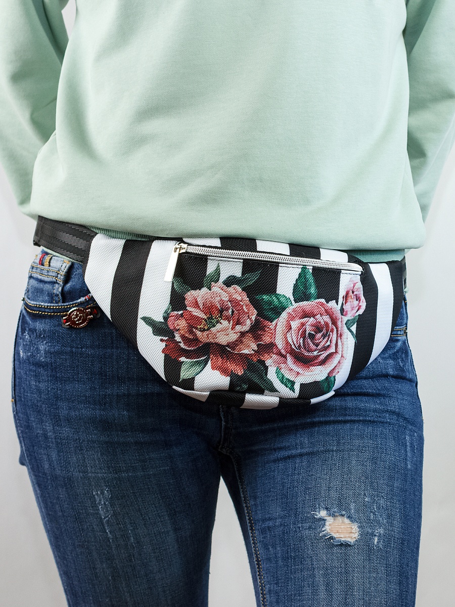 Поясная сумка . Современные разнообразные принты позволяют носить сумку как с повседневной так и со спортивной одеждой. Имеет два больших отделения под молнию. Основное отделение  не содержит дополнительных карманов и отсеков, а представляет из себя одно большое цельное пространство. Сзади карман под молнию. Минимальная длинна ремня 54 см, месте с сумкой минимальная длина окружности составляет 90 см. Максимальная длинна ремня 84 см. Вместе с сумкой максимальная длина окружности 120 см. Ремень оборудован прочным пластиковым замком типа фастекс.