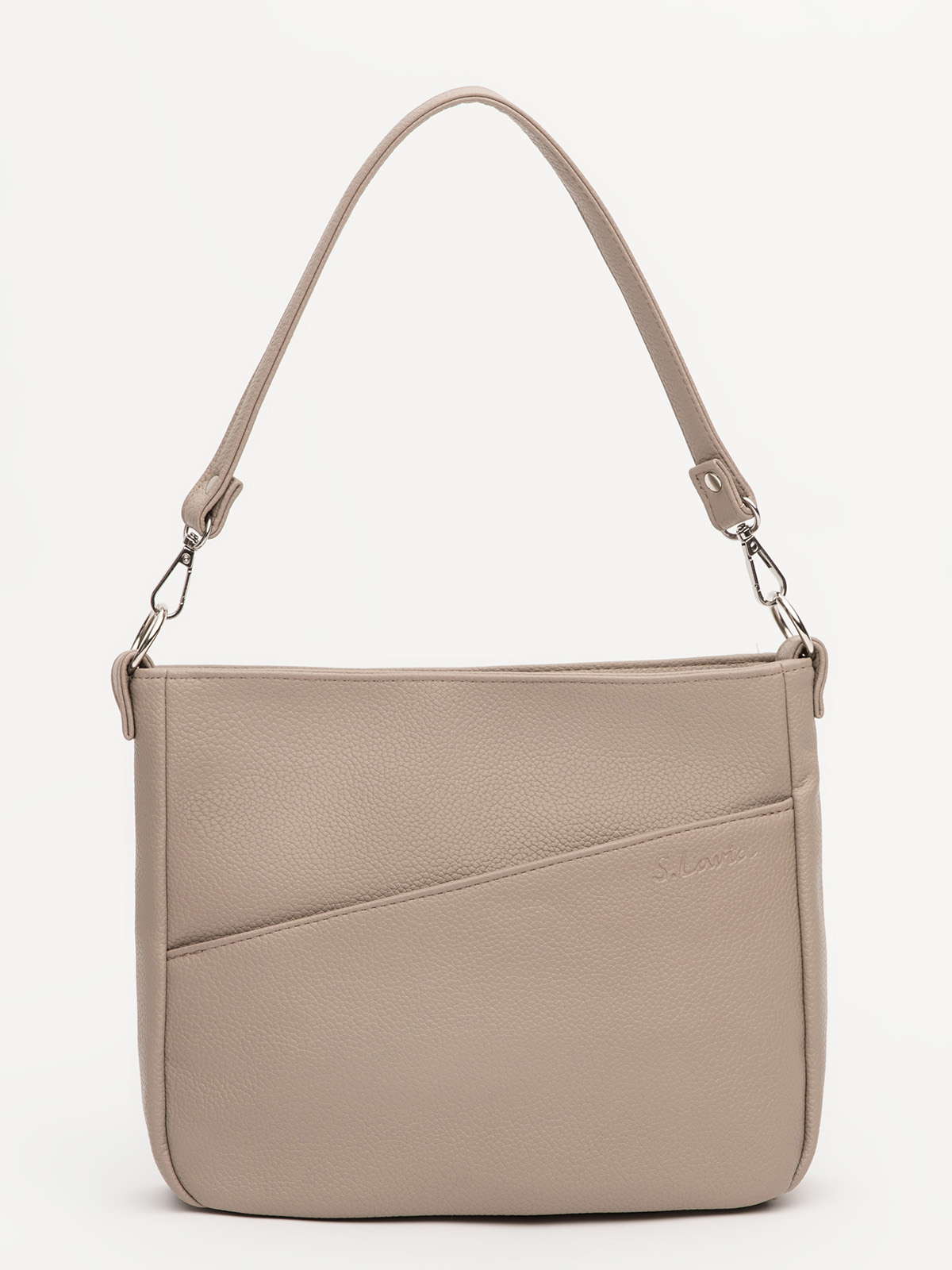 Геометричная форма с диагональным карманом и естественной складкой верха создаёт стильный женственный силуэт. В комплекте — съёмная короткая ручка и регулируемый ремень для разных вариантов ношения: в руке, на плече или через плечо.