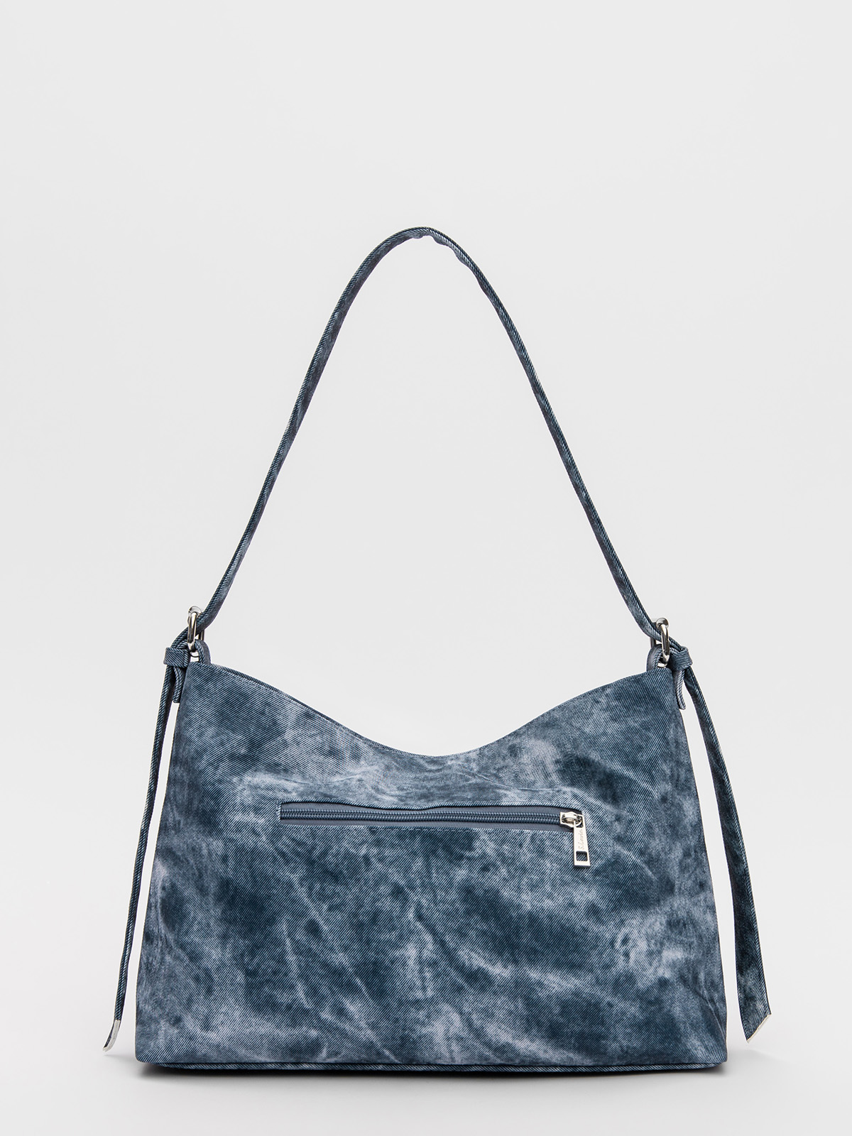 Элегантная форма хобо с декоративными ремнями и металлической фурнитурой представлена тёмно-синем оттенке. Сочетание винилискожи с отделкой под деним и эффектом тай-дай делает модель стильным акцентом в любом образе.