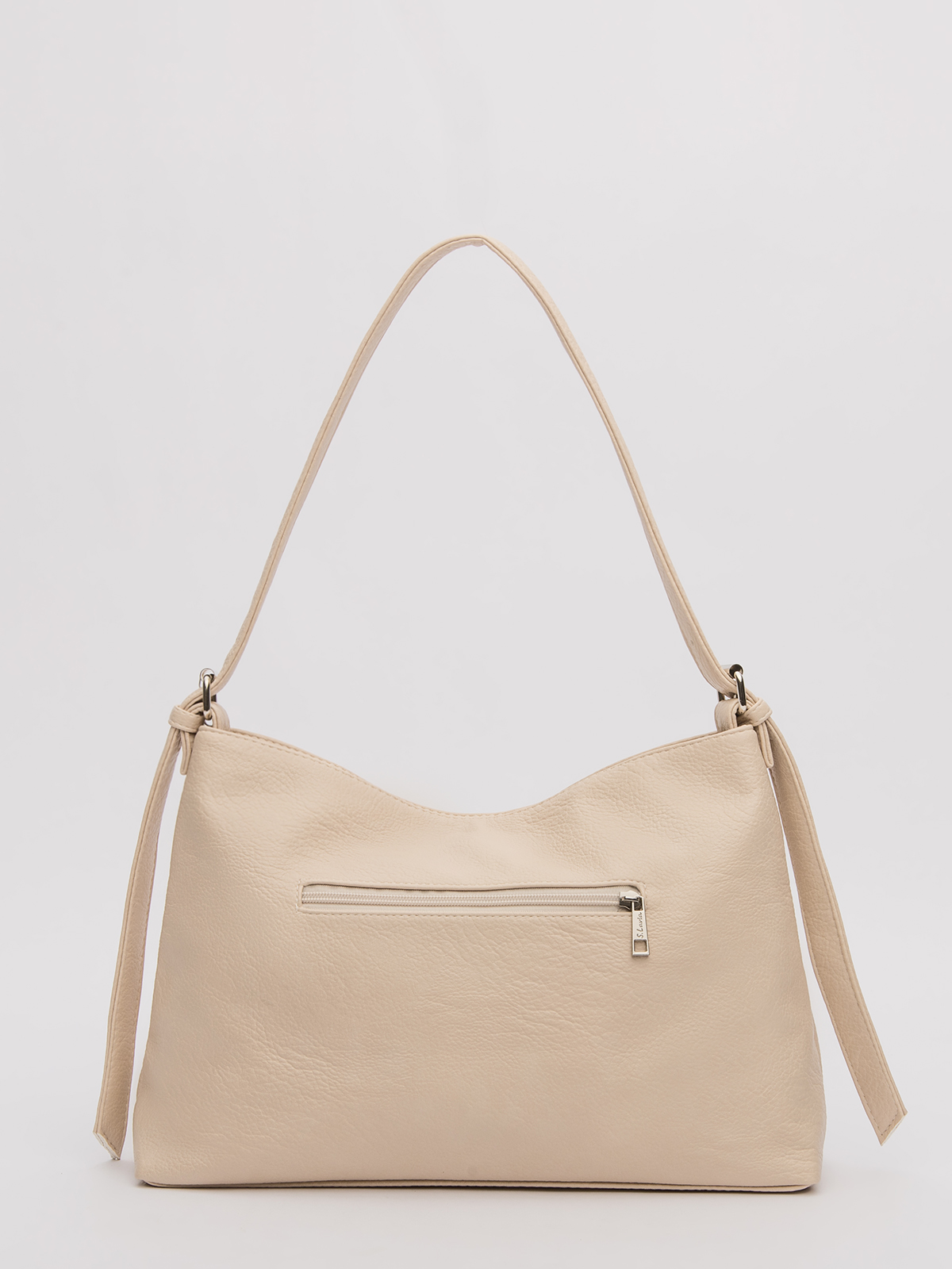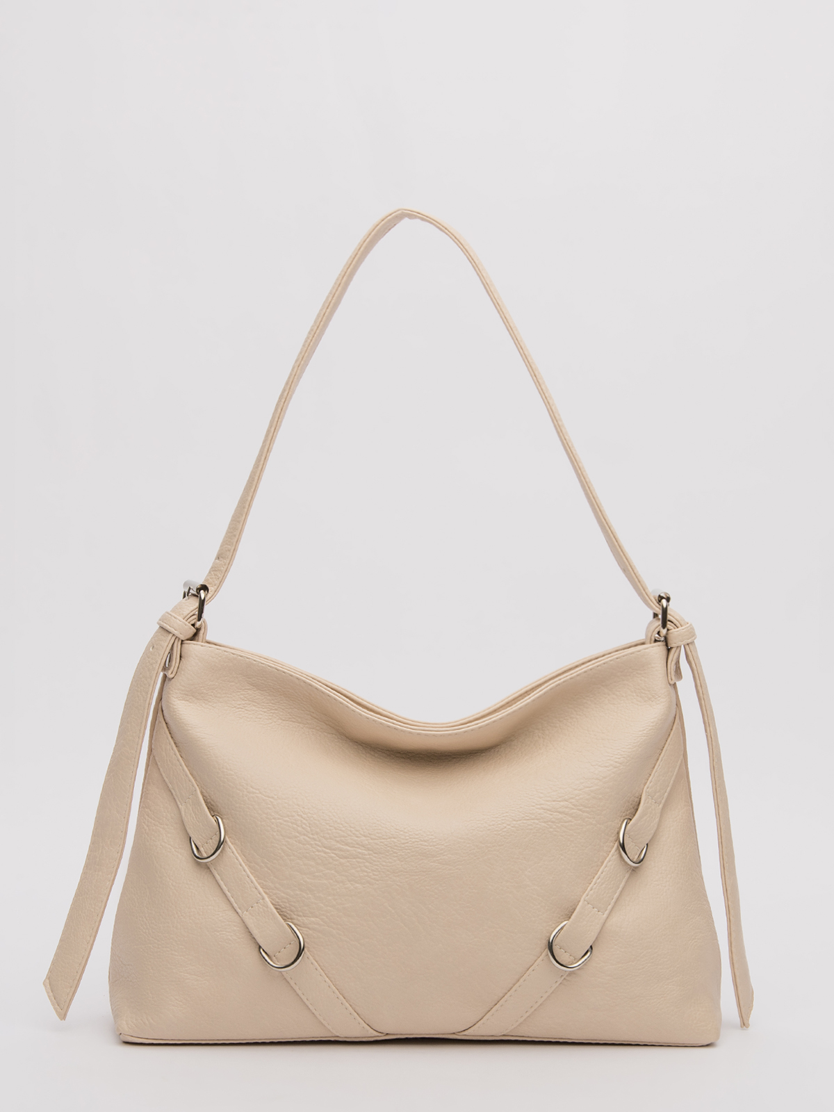 Элегантная форма хобо с декоративными ремнями и металлической фурнитурой представлена в классическом бежевом оттенке.