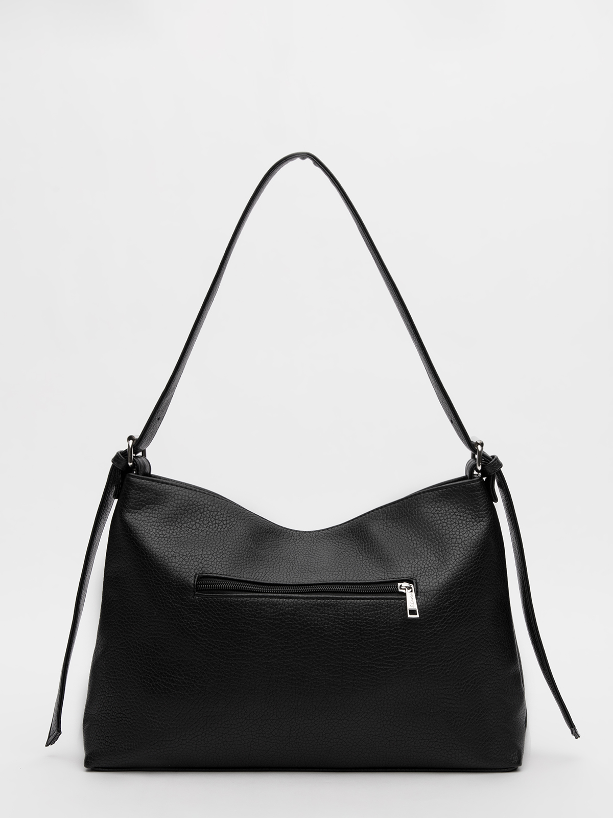 Элегантная форма хобо с декоративными ремнями и металлической фурнитурой представлена в классическом чёрном цвете.