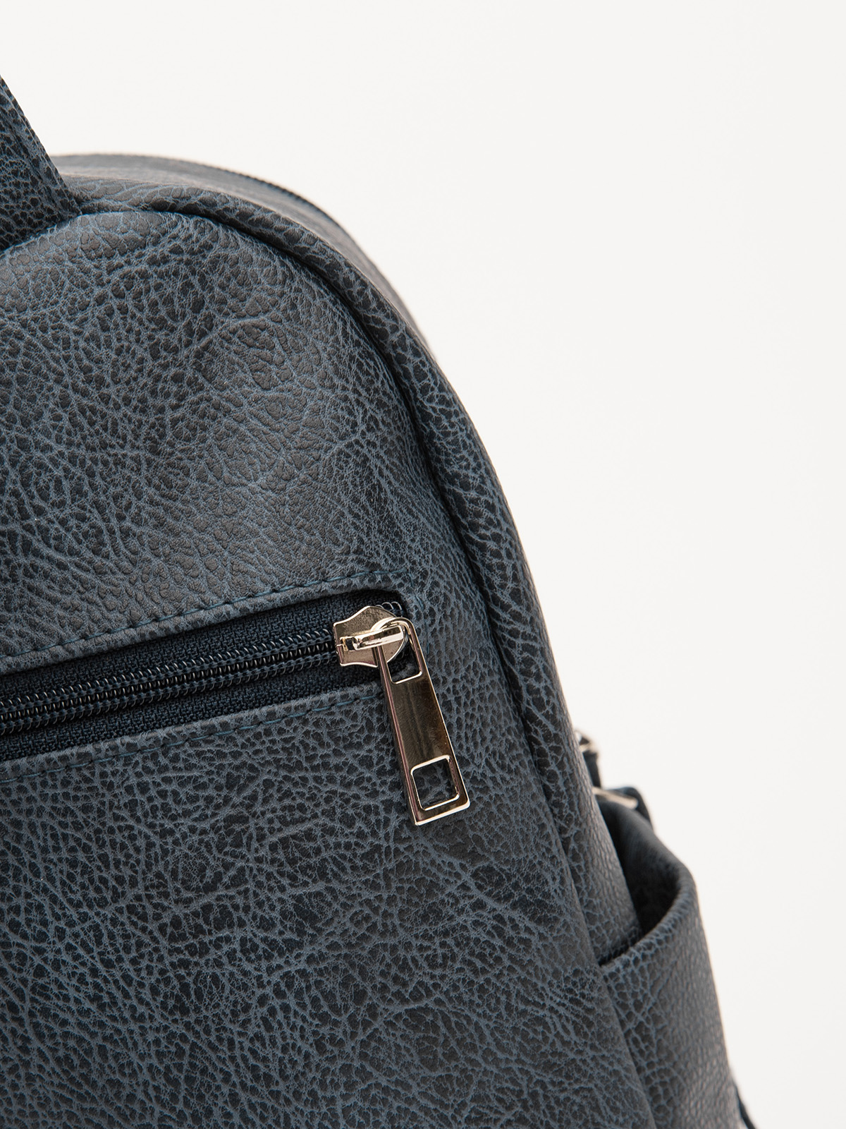 Его скруглённо-прямоугольная форма с рельефной фактурой кожи создаёт выразительный, но лаконичный силуэт. Передняя деталь с карманом на магните и тиснением подчёркивает трендовый характер модели, а боковые карманы на молнии (с кожаными наконечниками) добавляют практичности.