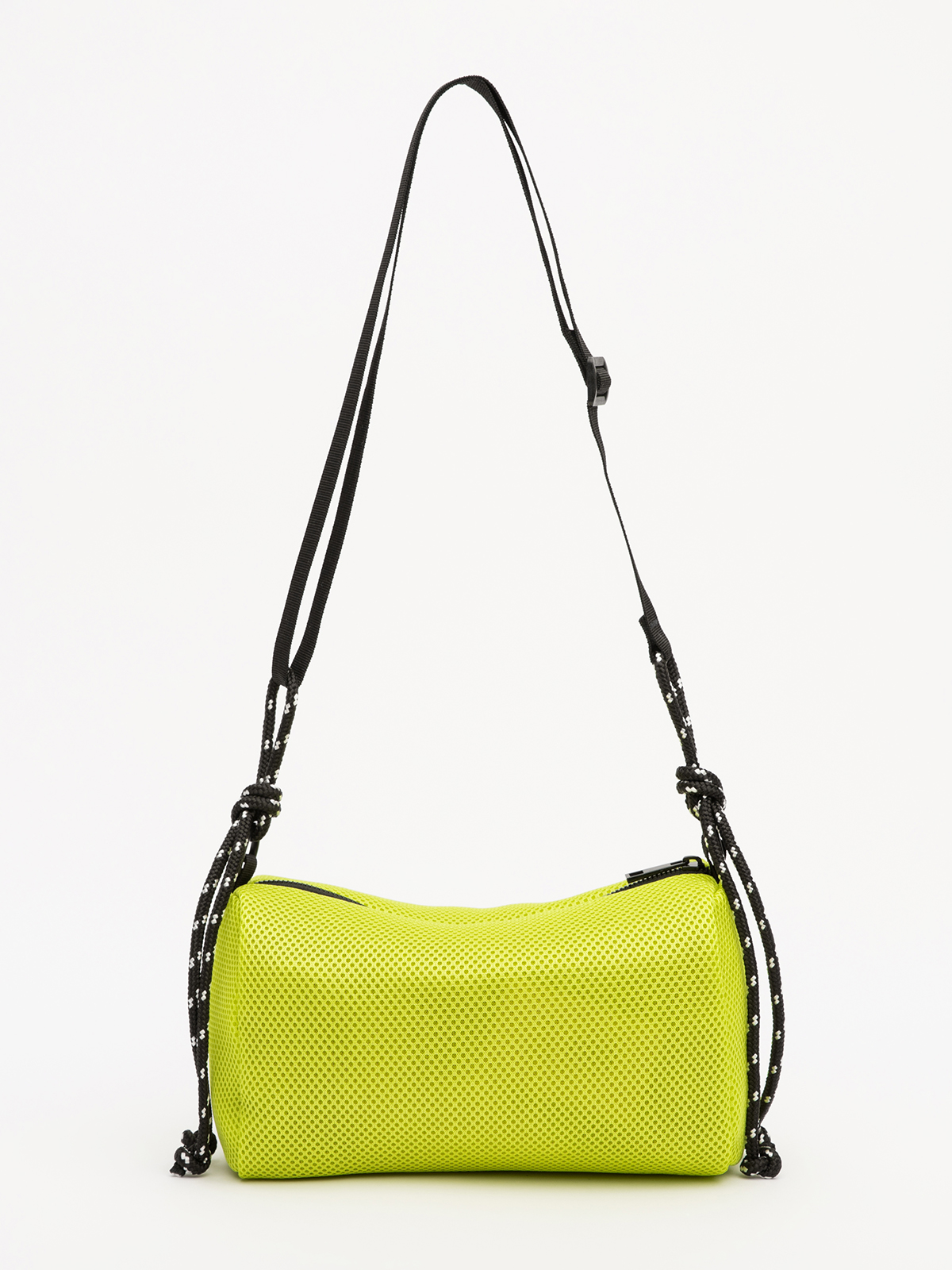 Её лаконичная форма бочонка из 3D-сетки выглядит современно и невесомо. Длинный регулируемый ремень с декоративными узлами добавляет образу лёгкую небрежность, сохраняя функциональность.