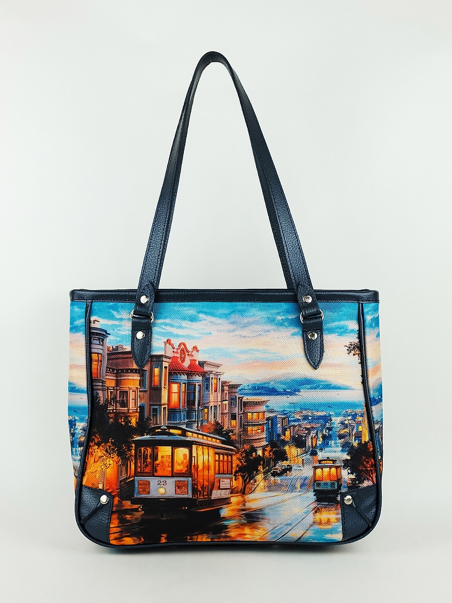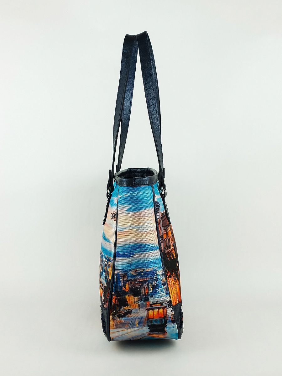 Современная, удобная, сумка выполнена из текстиля, с ручками и отделкой из натуральной кожи, внутри сумки есть 2 открытых кармана для мелочей и один на молнии, легкая, проста в уходе. В сумку входят документы формата А4. Подходит для ношения на плече.