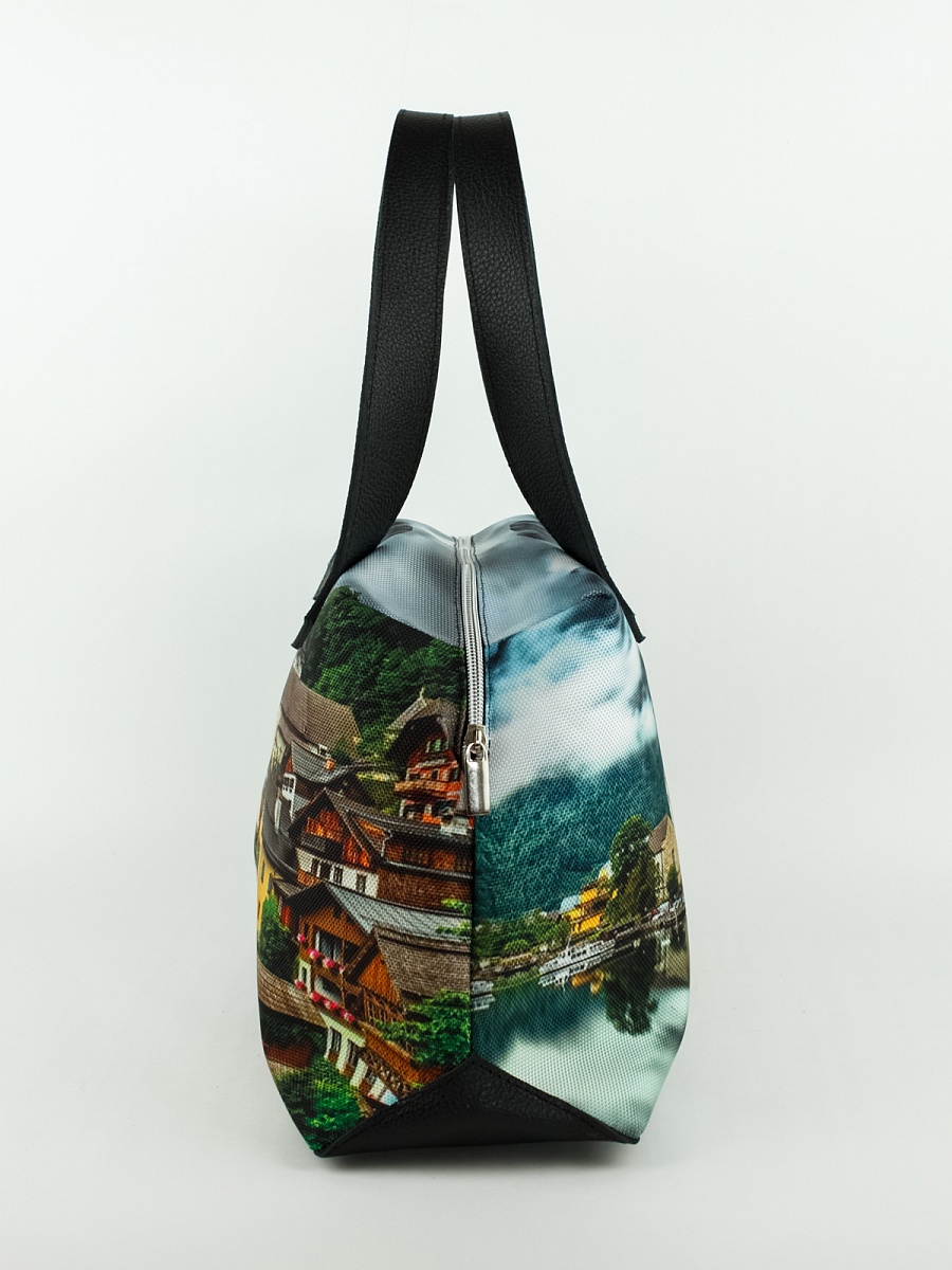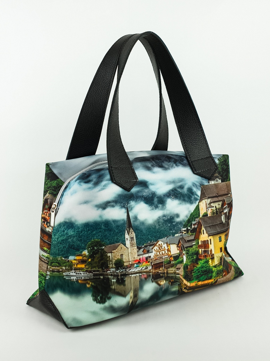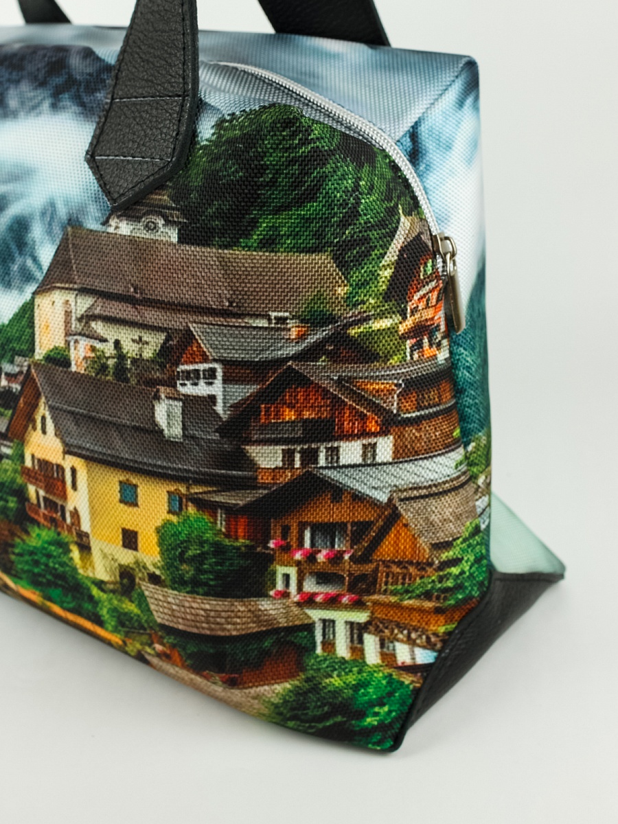Современная, удобная, сумка  выполнена из текстиля, с ручками и отделкой из натуральной кожи, внутри сумки есть два кармана  формата А6: открытый и на молнии. Так же еще один открытый карман формата А5. Сумочка вместительная легкая, проста в уходе. Ткань не линяет.