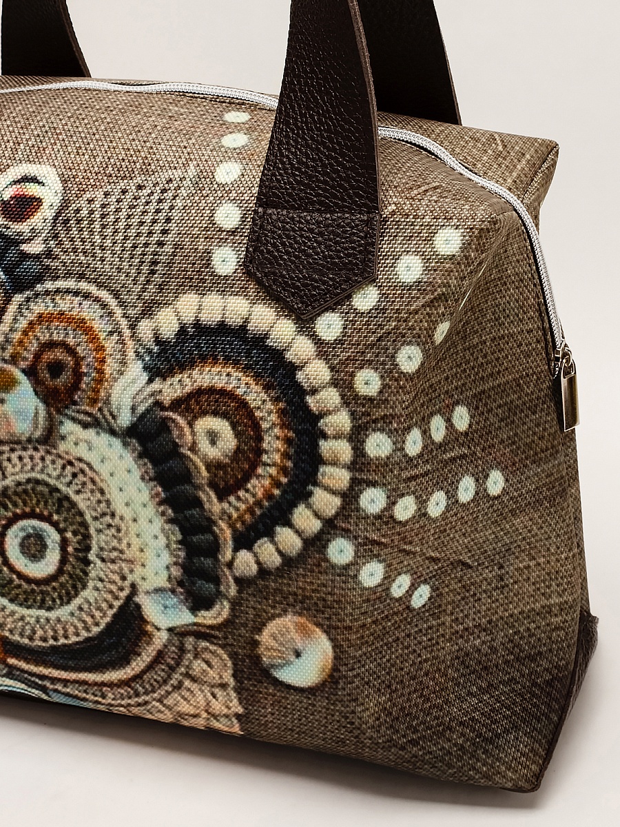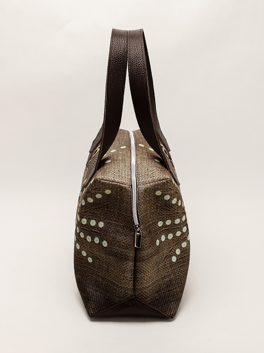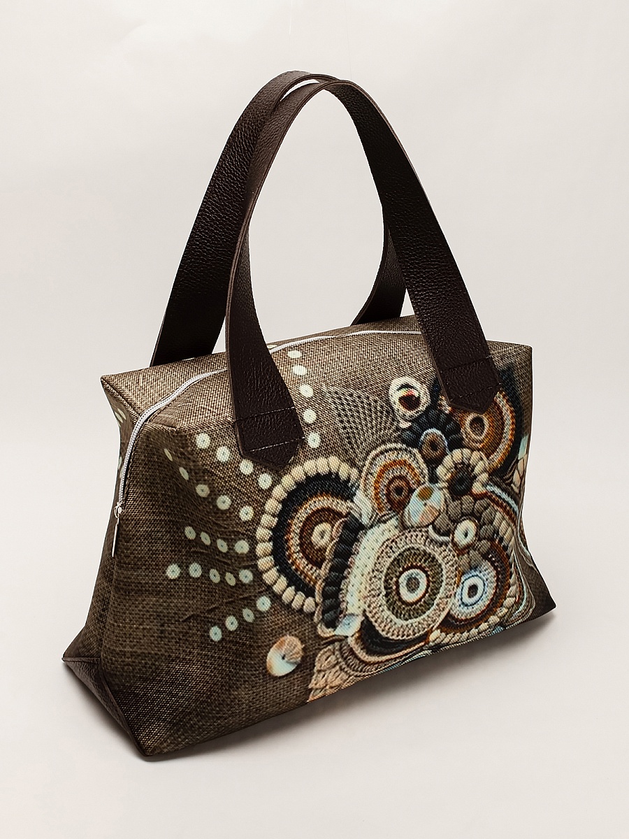 Современная, удобная, сумка  выполнена из текстиля, с ручками и отделкой из натуральной кожи, внутри сумки есть два кармана  формата А6: открытый и на молнии. Так же еще один открытый карман формата А5. Сумочка вместительная легкая, проста в уходе. Ткань не линяет.
