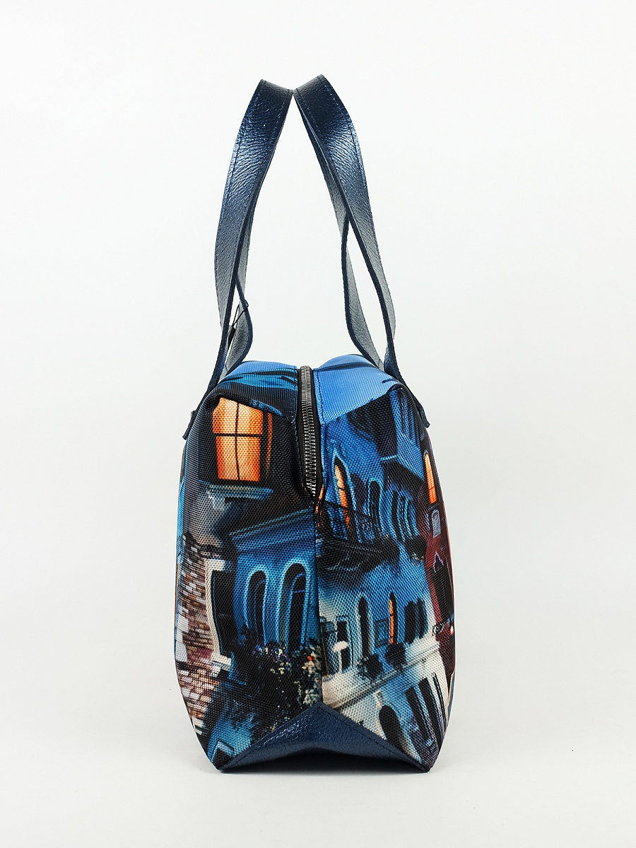 Современная, удобная, сумка  выполнена из текстиля, с ручками и отделкой из натуральной кожи, внутри сумки есть два кармана  формата А6: открытый и на молнии. Так же еще один открытый карман формата А5. Сумочка вместительная легкая, проста в уходе. Ткань не линяет.
