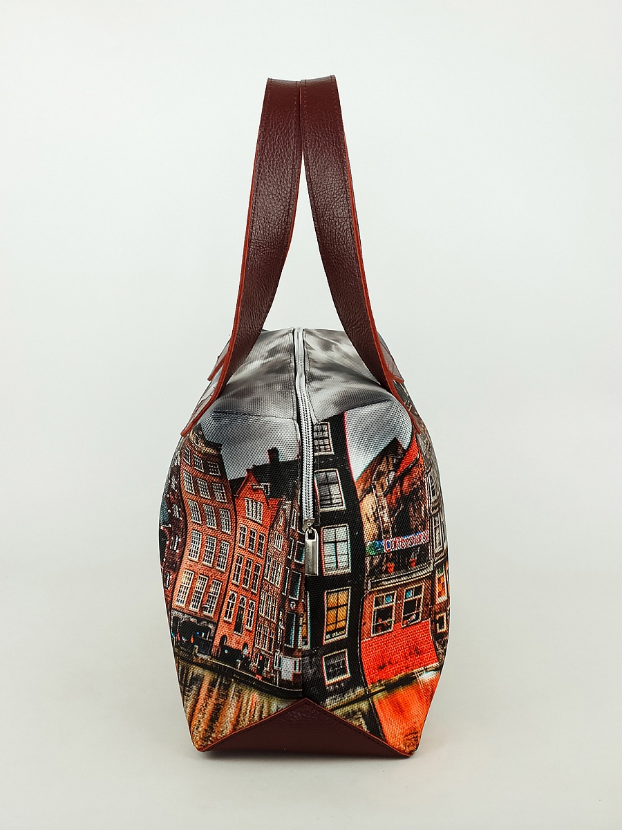 Современная, удобная, сумка  выполнена из текстиля, с ручками и отделкой из натуральной кожи, внутри сумки есть два кармана  формата А6: открытый и на молнии. Так же еще один открытый карман формата А5. Сумочка вместительная легкая, проста в уходе. Ткань не линяет.