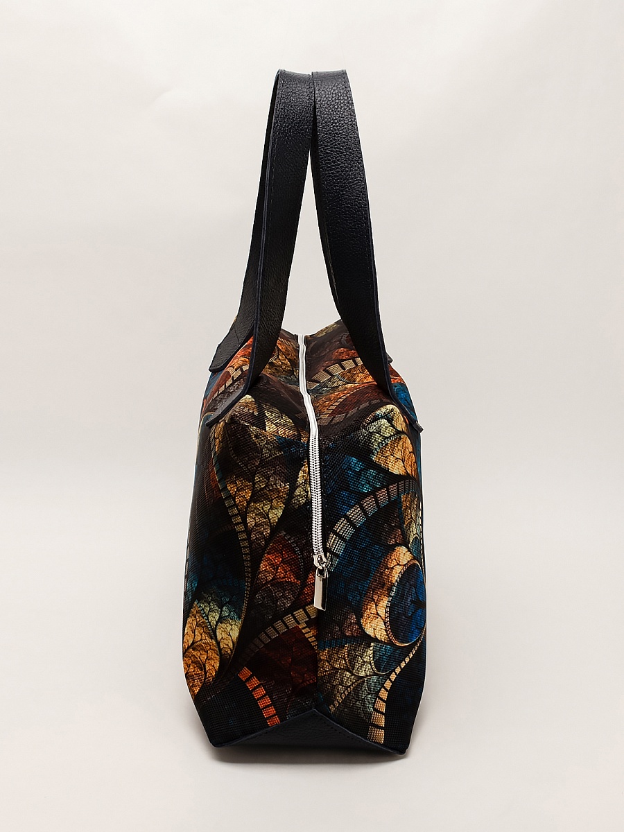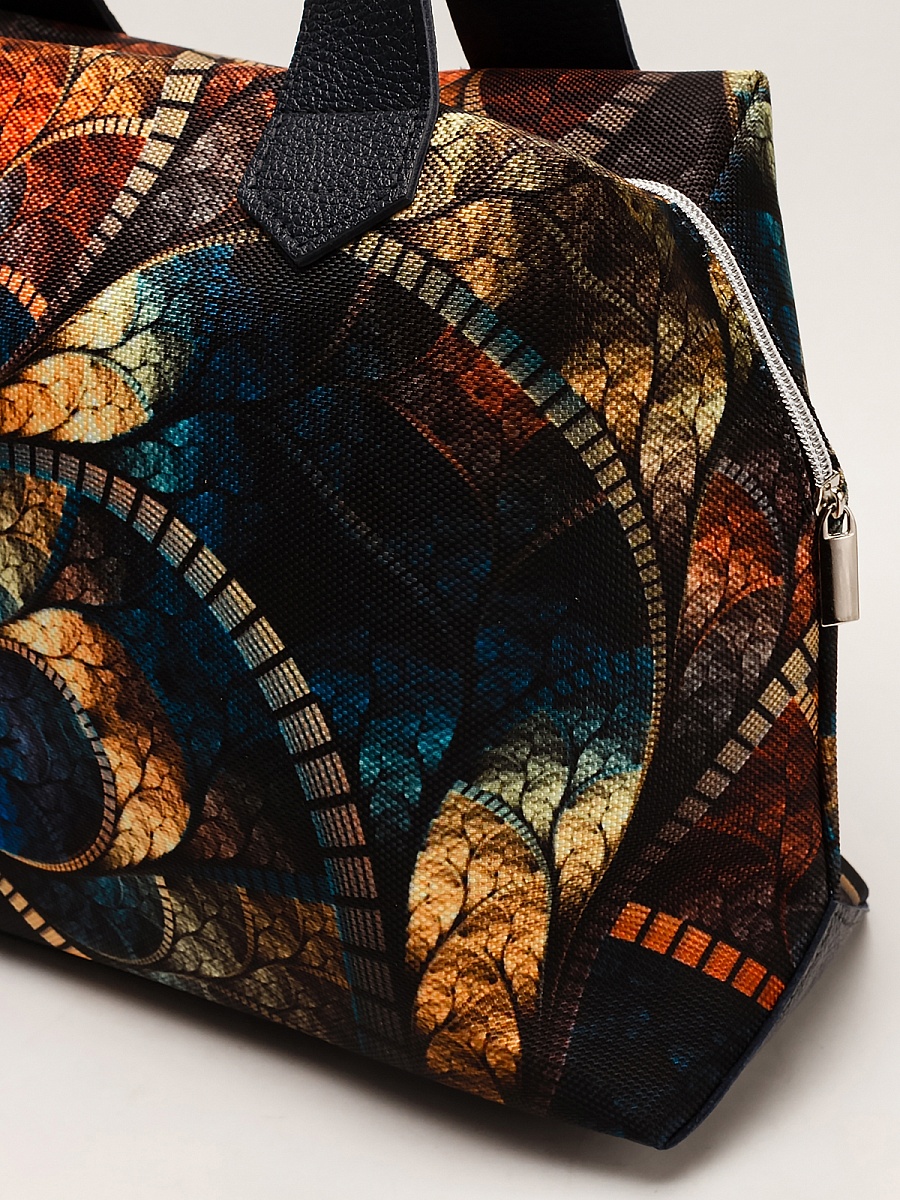 Современная, удобная, сумка  выполнена из текстиля, с ручками и отделкой из натуральной кожи, внутри сумки есть два кармана  формата А6: открытый и на молнии. Так же еще один открытый карман формата А5. Сумочка вместительная легкая, проста в уходе. Ткань не линяет.
