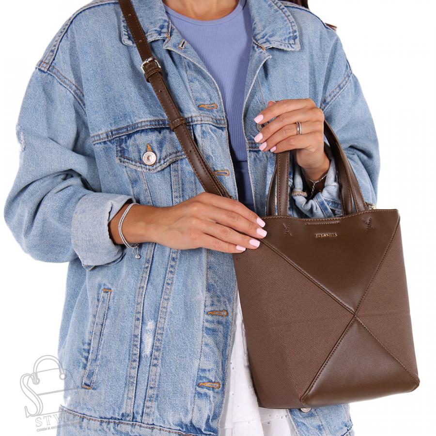 Модель-торба, выполнена из  экокожи. Декорирована вставками на корпусе. Дополнена золотистой фурнитурой. Данная модель закрывается на кнопку. Каркас полужесткий. Носится в руке за встроенные ручки или на плече. В комплекте есть ремень с регулировкой длины.