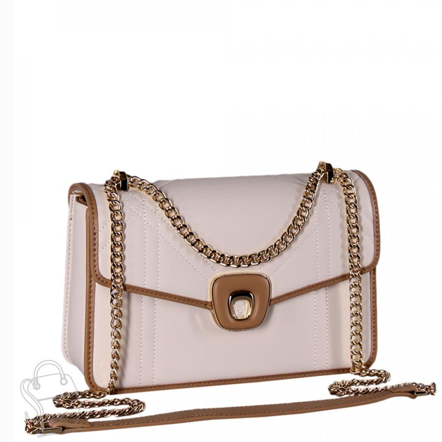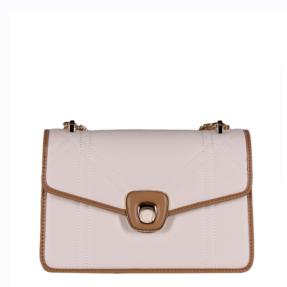 Элегантная сумка на цепочке, выполнена из экокожи. Декорирована контрастными деталями.  Дополнена золотистой фурнитурой. Данная модель закрывается на клапан. Каркас жесткий. Носится в руке или на плече. Встроенная цепочка перетягивается.