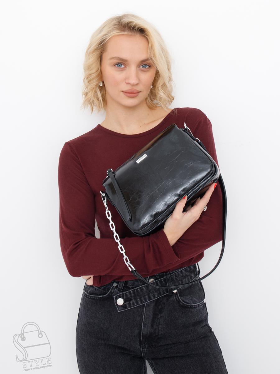 Сумка кросс-боди, выполнена из экокожи. Дополнена серебристой фурнитурой. Данная модель закрывается на молнию. Каркас полужесткий. Носится  через плечо или на плече. В комплекте имеется съемный ремень с регулировкой длины и удлиненная ручка.