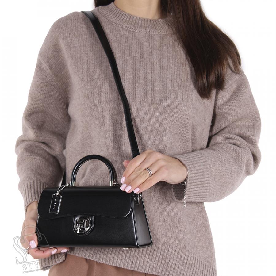 Миниатюрная модель, выполнена из экокожи. Декорирована брелоком.  Дополнена серебристой фурнитурой. Данная модель закрывается на клапан. Каркас жесткий. В комплекте встроенная ручка и съемный ремень с регулировкой длины.