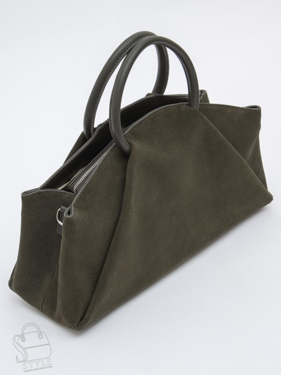 Модель с акцентными ручками, выполнена из натуральной замши. Декорирована складками на корпусе. Дополнена серебристой фурнитурой. Данная модель закрывается на молнию, носится в руке за встроенные ручки. Или на плече, в комплекте имеется ремень с регулировкой длины. Каркас полужесткий.