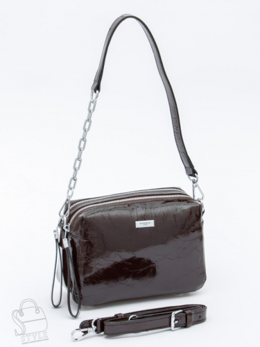 Стильная модель, выполнена из натуральной кожи. Декорирована брелоком. Дополнена серебристой фурнитурой.  Данная модель закрывается на клапан. Носится в руке за встроенную ручку или на плече, съемный ремень регулируется по длине. Каркас полужесткий.