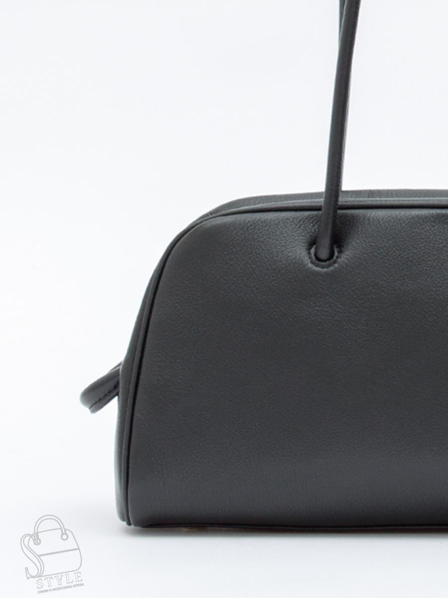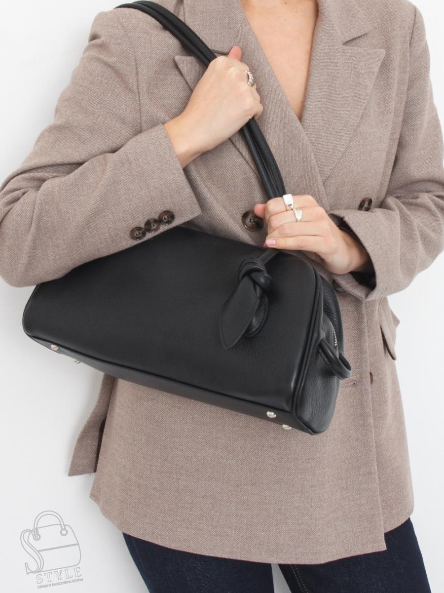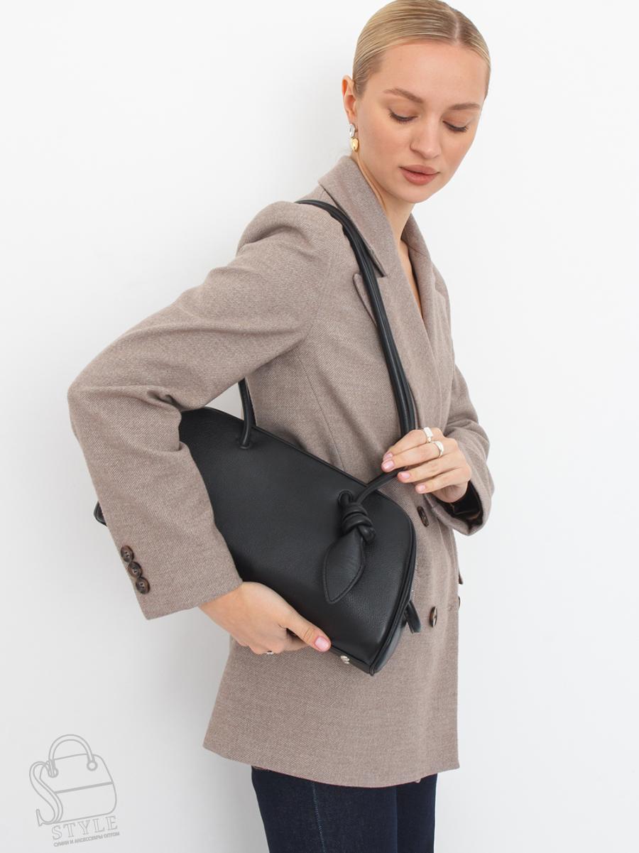 Формованная модель, выполнена из натуральной кожи. Декорирована узлом на ручке. Дополнена блестящей серебристой фурнитурой. Данная модель закрывается на молнию, носится в руке за встроенные ручки или на плече. Каркас полужесткий. На дне предусмотрены ножки.