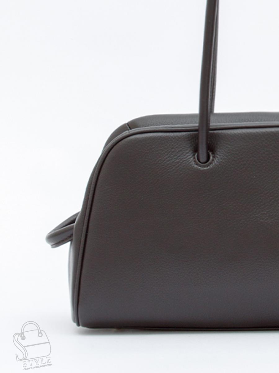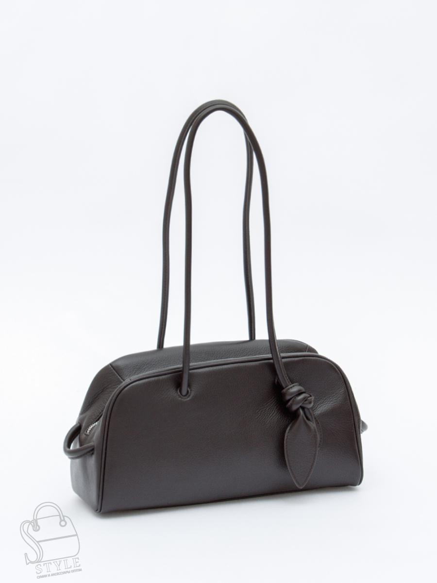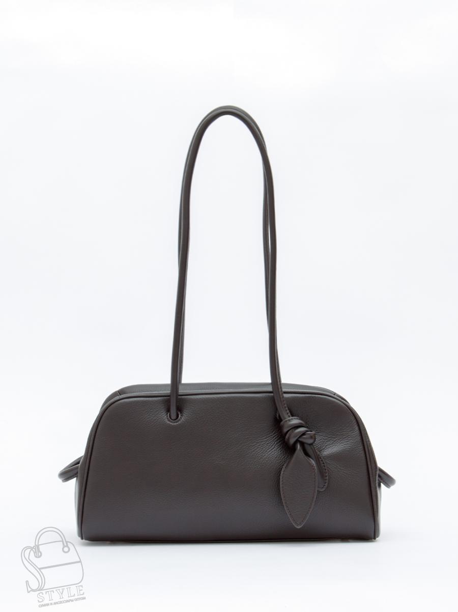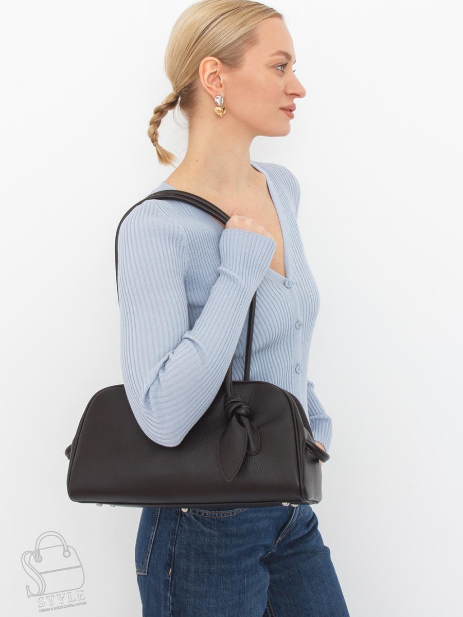 Формованная модель, выполнена из натуральной кожи. Декорирована узлом на ручке. Дополнена блестящей серебристой фурнитурой. Данная модель закрывается на молнию, носится в руке за встроенные ручки или на плече. Каркас полужесткий. На дне предусмотрены ножки.