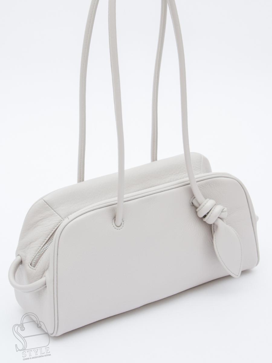 Формованная модель, выполнена из натуральной кожи. Декорирована узлом на ручке. Дополнена блестящей серебристой фурнитурой. Данная модель закрывается на молнию, носится в руке за встроенные ручки или на плече. Каркас полужесткий. На дне предусмотрены ножки.