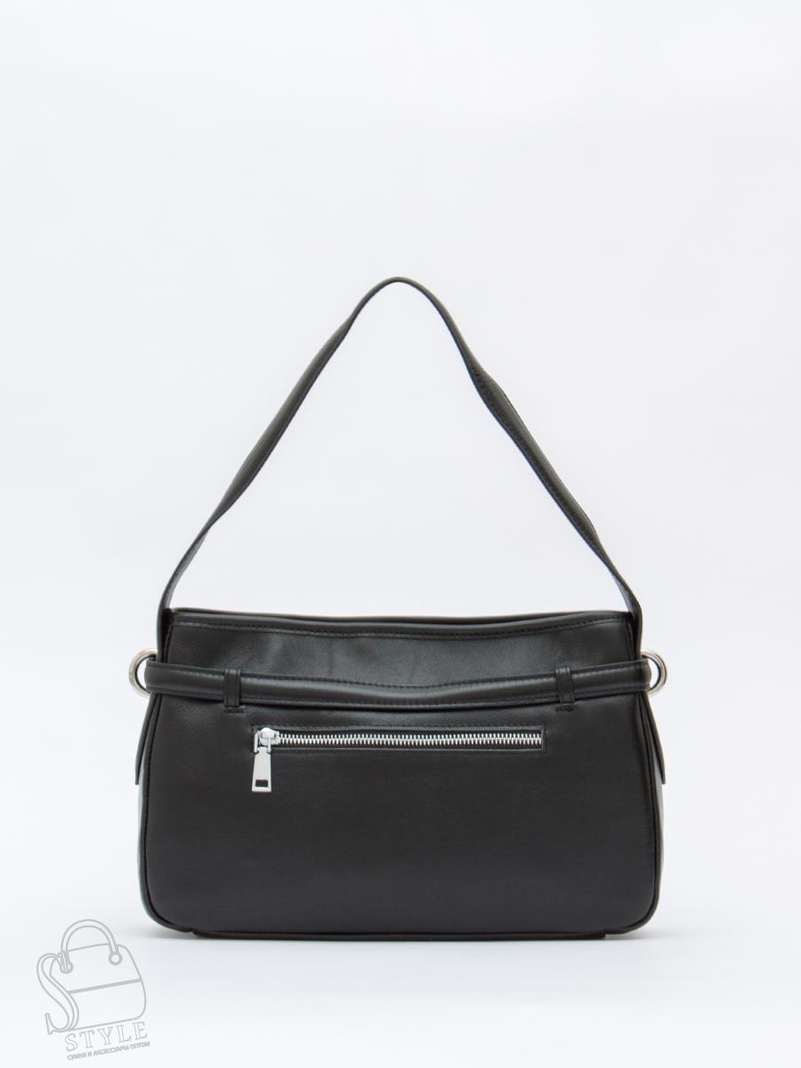 Модель-багет, выполнена из кожи. Декорирована ремнем на корпусе. Дополнена серебристой фурнитурой. Данная модель закрывается на молнию. Каркас полужесткий. Носится в руке за встроенную ручку или на плече. В комплекте имеется съемный ремень с регулировкой длины.