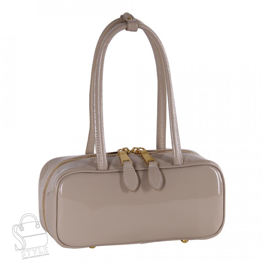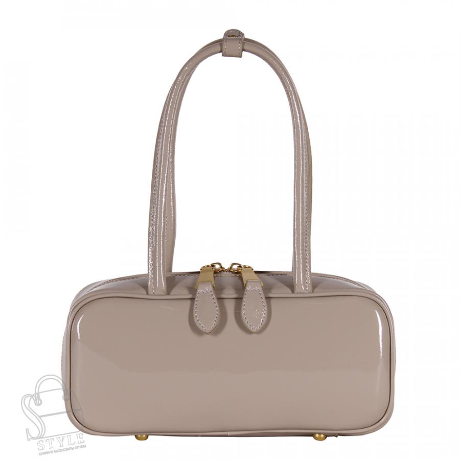 Сумка-такса, выполнена из натуральной лакированной кожи.  Дополнена матовой золотистой фурнитурой. Данная модель закрывается на молнию, носится в руке за встроенные удлиненные ручку. На них имеется фиксатор. На дне предусмотрены ножки.