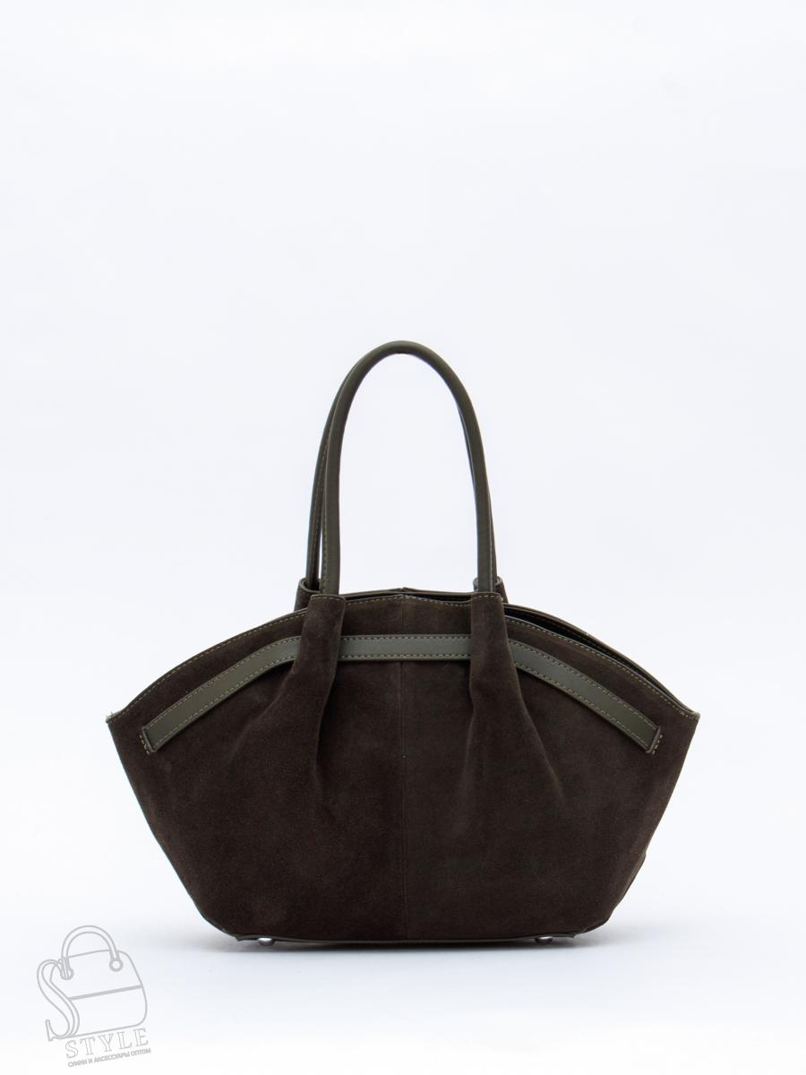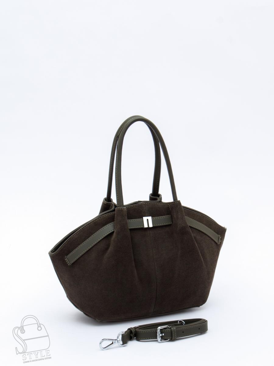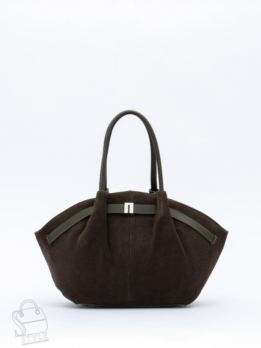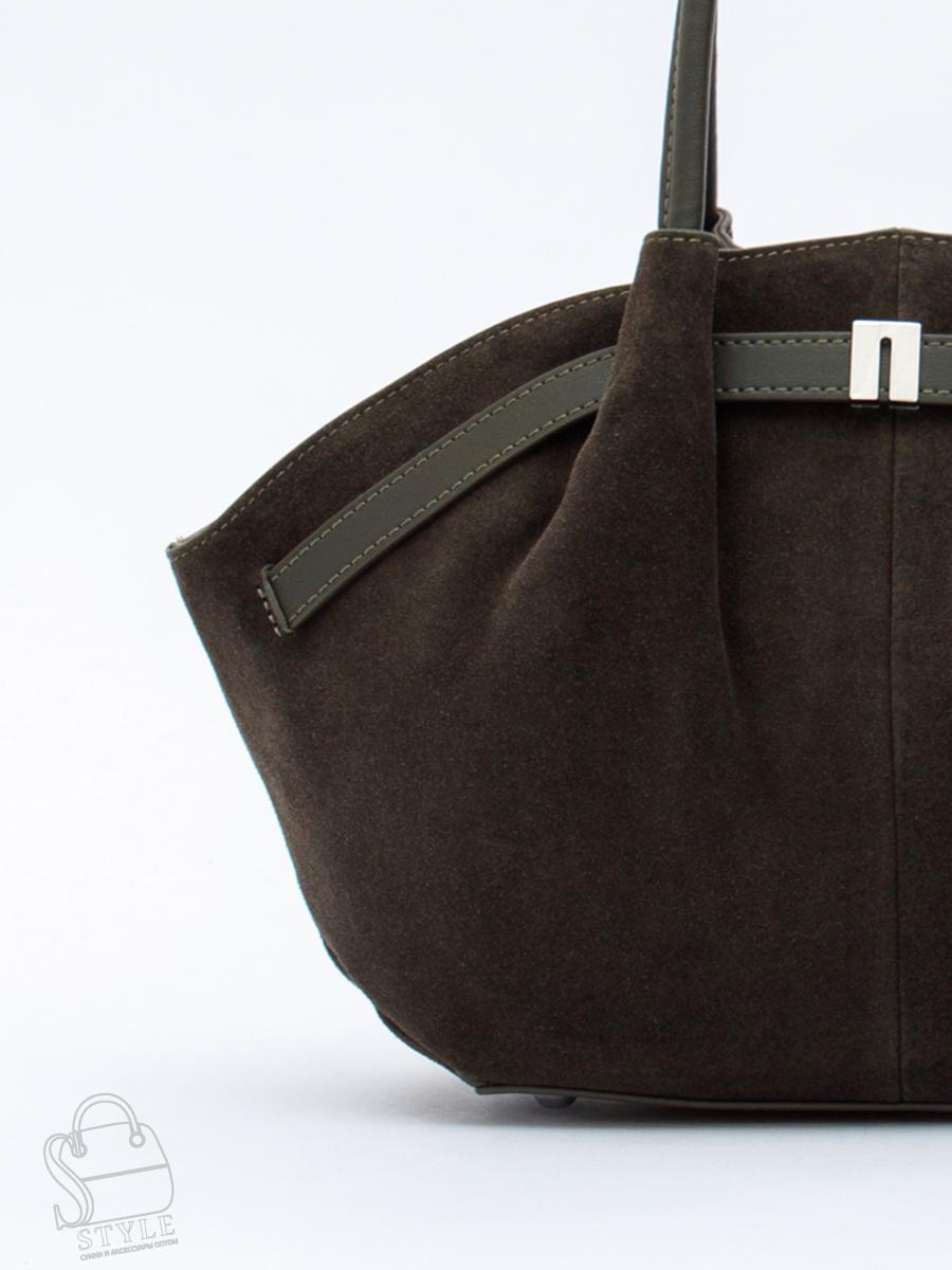 Сумка в форме лодочки, выполнена из замши. Декорирована ремнем на корпусе. Дополнена серебристой фурнитурой. Данная модель закрывается на молнию. Каркас полужесткий.  Носится на плече или в руке. В комплекте имеется съемный ремень с регулировкой длины и две встроенные ручки.