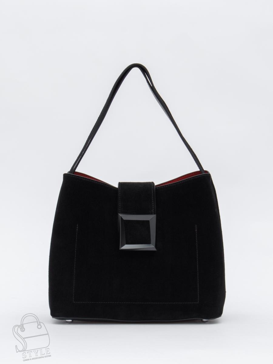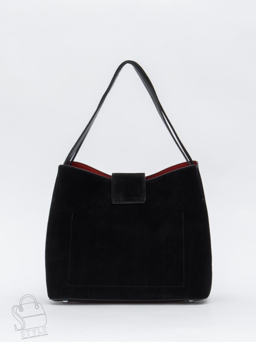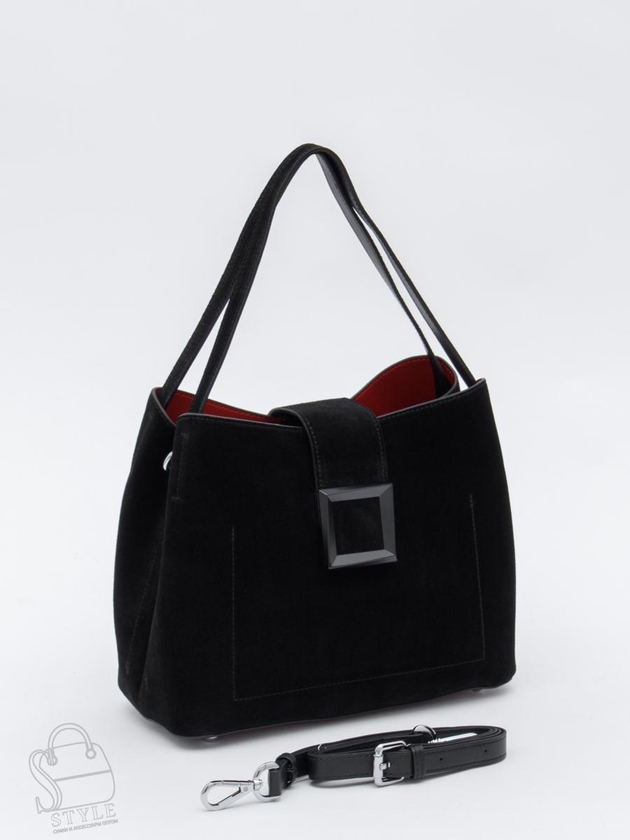 Базовая сумка, выполнена из замши. Декорирована контрастным подкладом. Дополнена серебристой фурнитурой. Данная модель закрывается на хлястик. Каркас полужесткий. Носится в руке за встроенные ручки, или на плече. В комплекте имеется съемный ремень с регулировкой длины.
