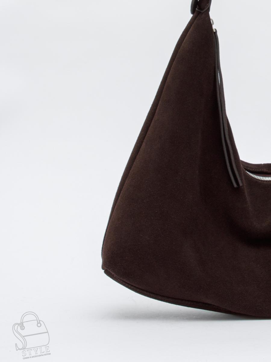 Модель-хобо, выполнена из замши. Дополнена серебристой фурнитурой. Данная модель закрывается на молнию, носится в руке за встроенный ремень с регулировкой длины. Каркас мягкий.