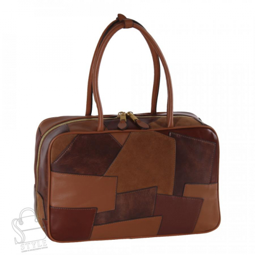 Интересная сумка, выполнена из натуральной кожи. Декорирована кусочка кожи. Дополнена золотистой фурнитурой. Данная модель закрывается на молнию, носится в руке за ручки. Каркас полужесткий.