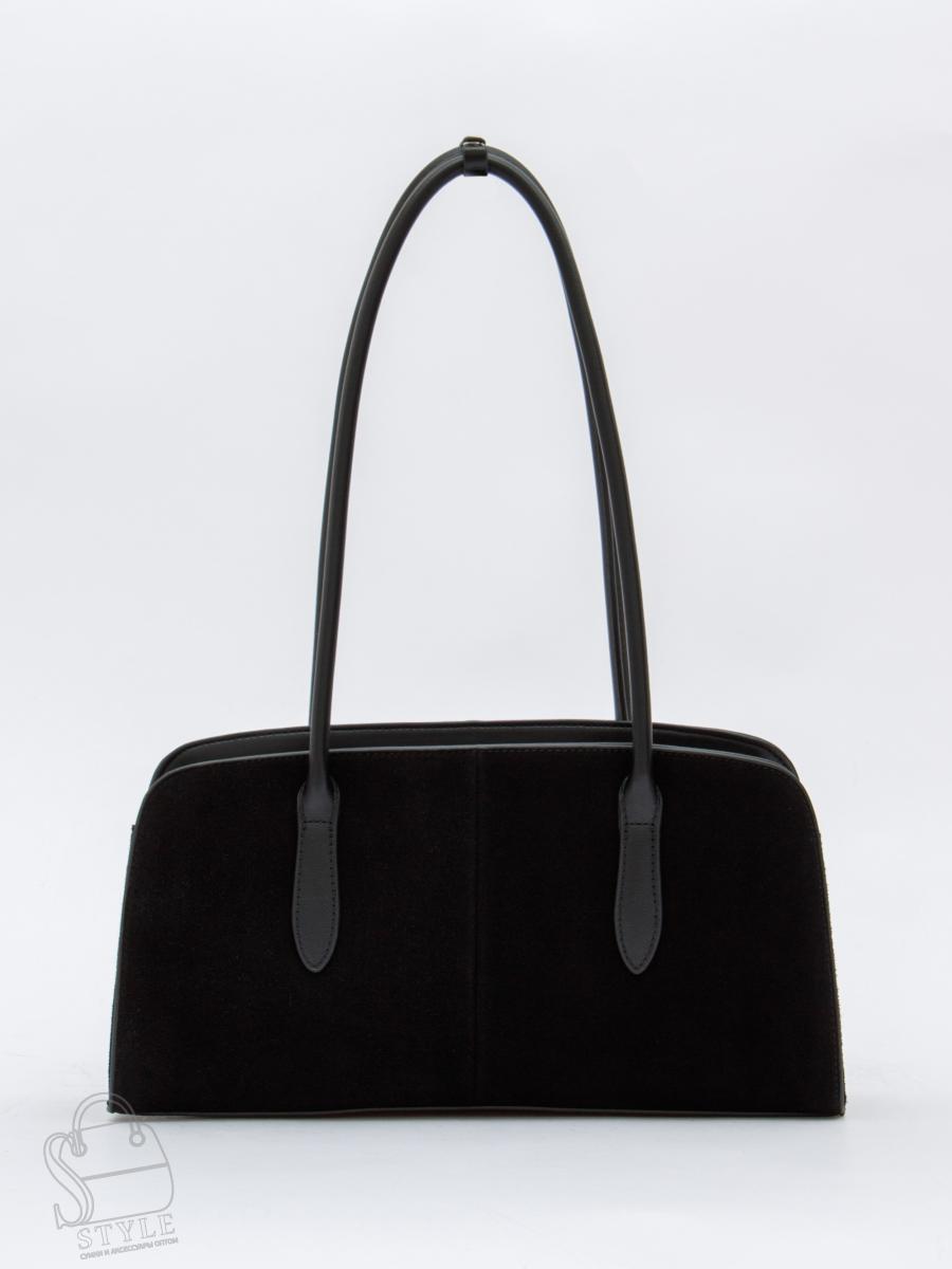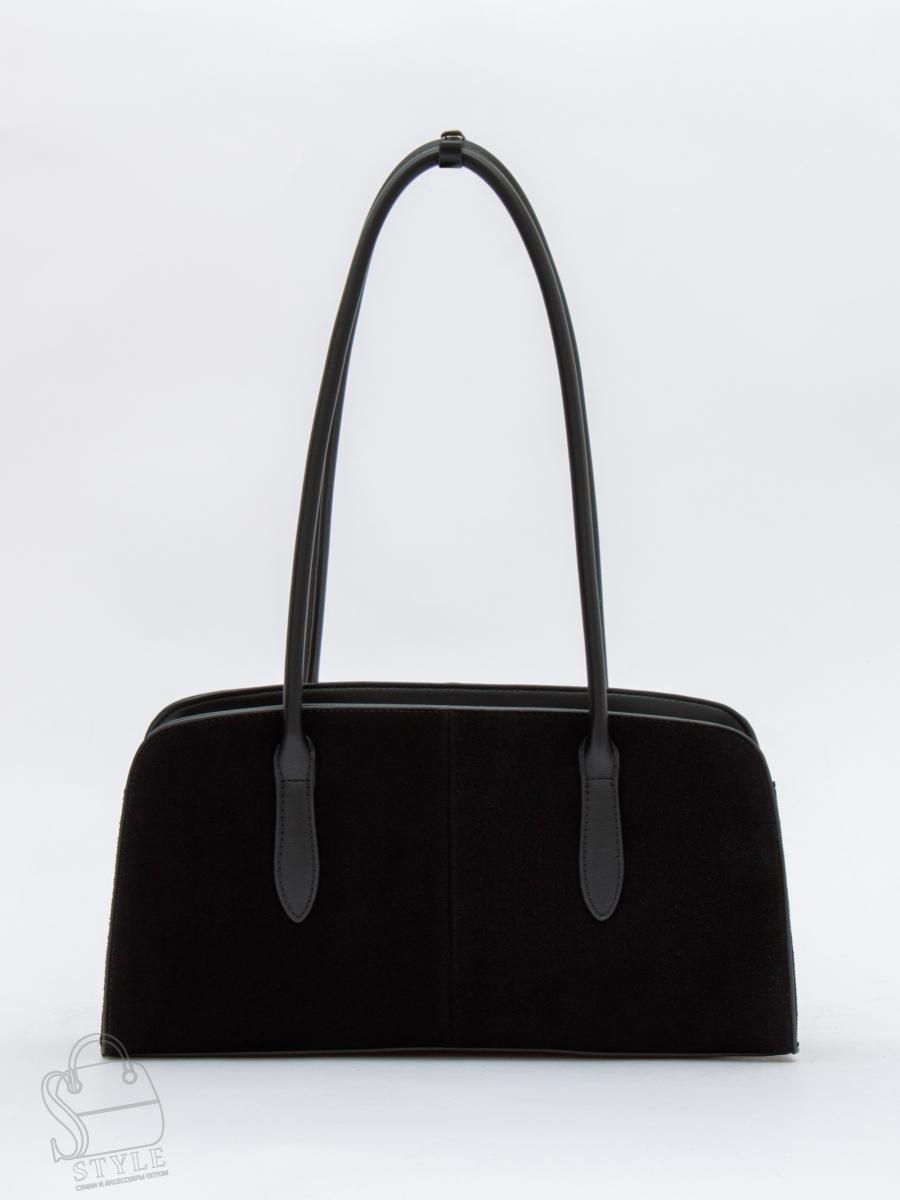 Базовая сумка на каждый день выполнена из натуральной замши. Дополнена серебристой фурнитурой. Основной отдел закрывается на молнию. Сумка носится на плече за удлинённые ручки или через плечо. Каркас полужёсткий.